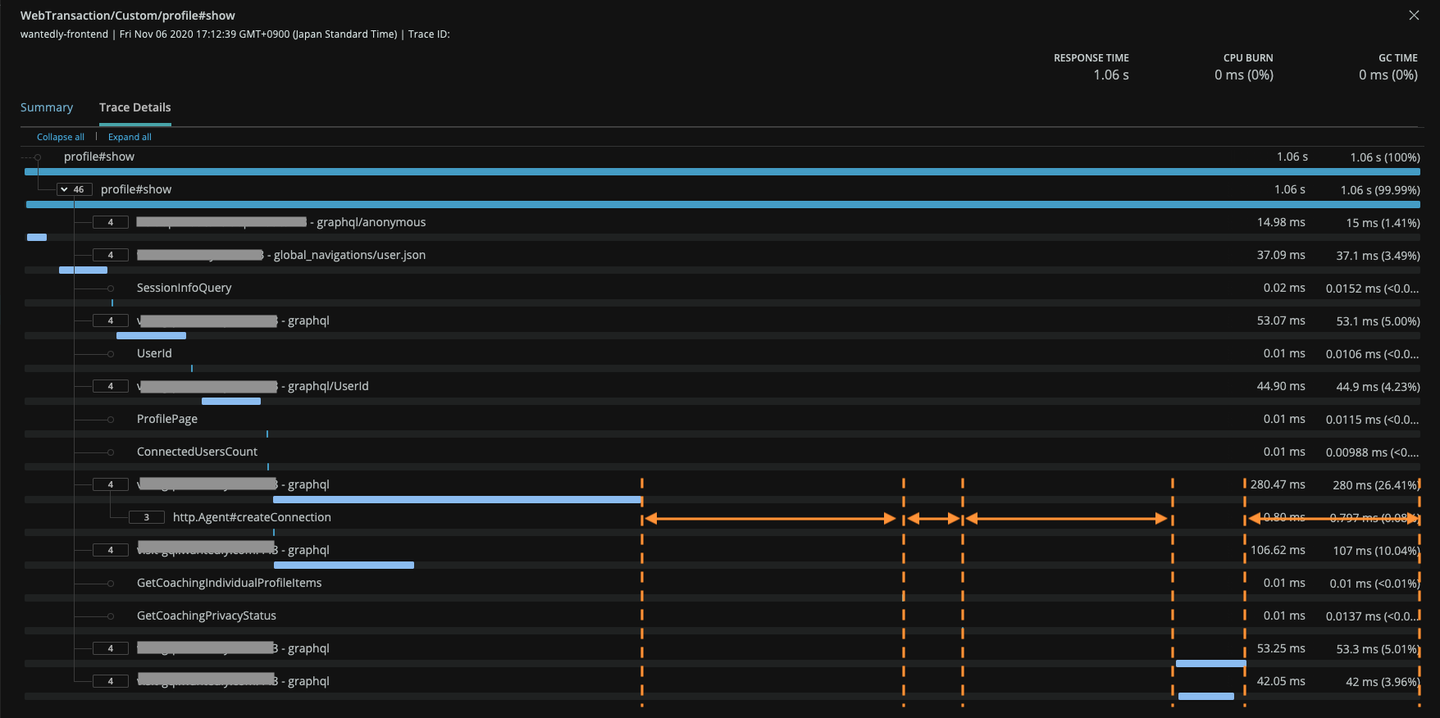 New Relic は閾値を超えて遅い個別トランザクションの詳細を見る機能 があり、そこで実際にどのクエリにどれくらい時間をかけているかが可視化されます。以下の画像が実際の Transaction detail です。 (オレンジの線は後から書き込んだものです。書き込み前の画像残ってなかった。)