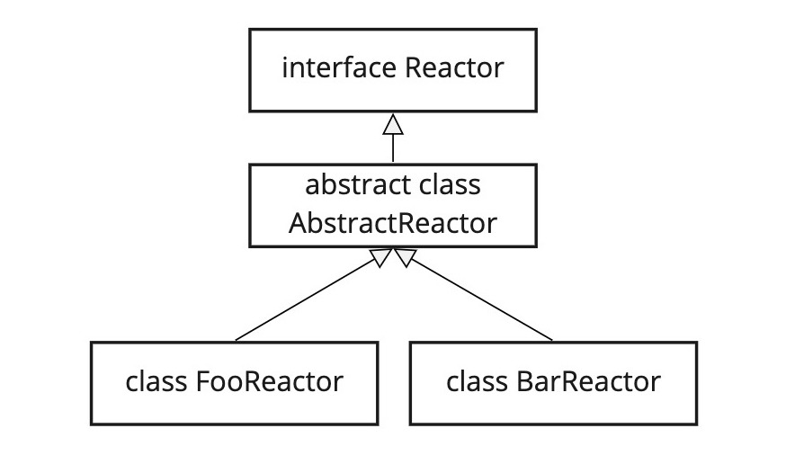 フレームワークとして機能させるために、Reactorに対する抽象クラスを実装します。 具象的なReactorはこのAbstractReactorを継承する形になります。