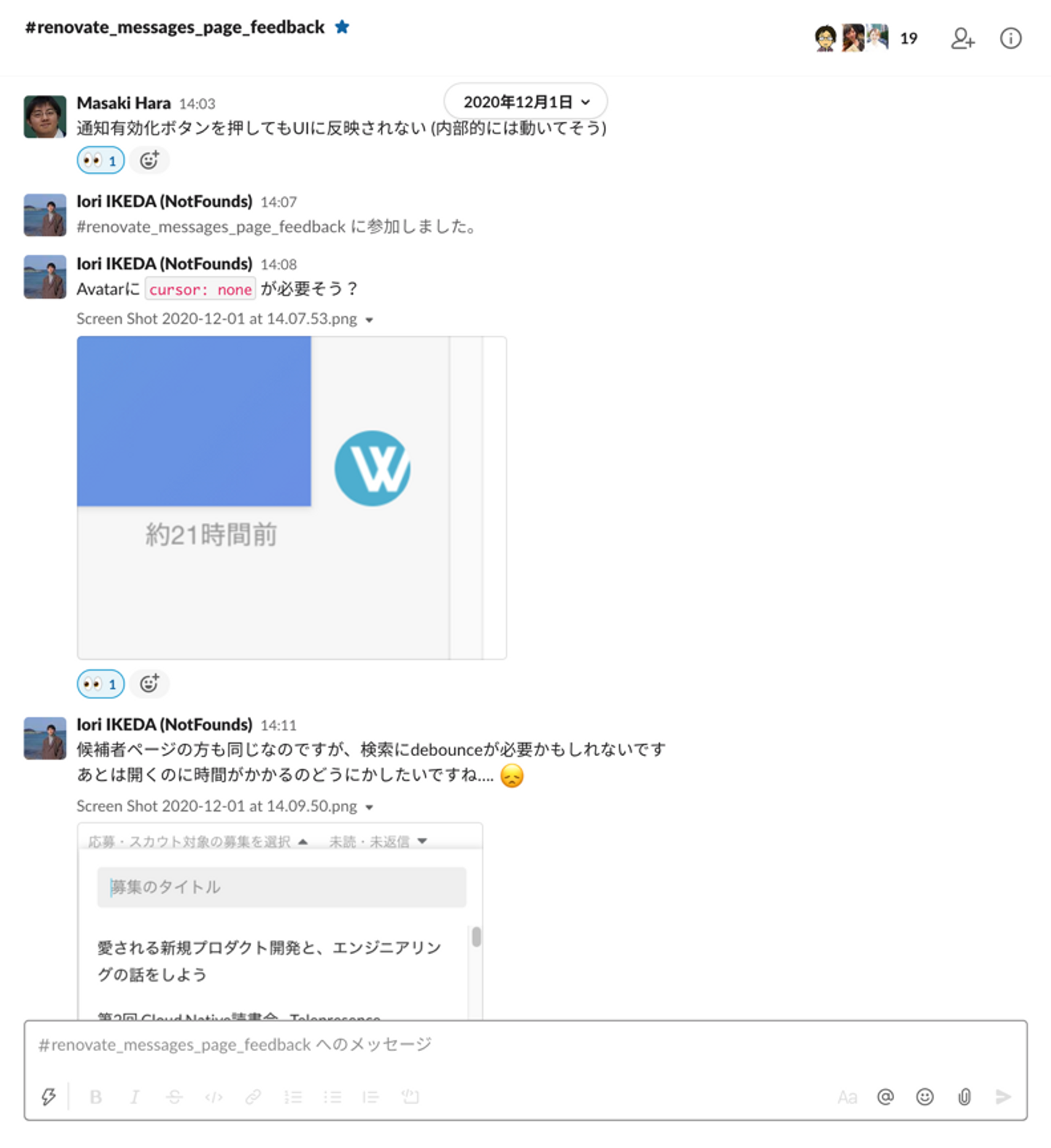 また、QA環境を社内に公開してフィードバックをもらうということも行なっています。多くのメンバーが新しいページを触ってみることで、実装漏れや予想外の挙動を見つけることができます。また使いにくい点やわかりにくい点を見つけることもできます。今回のリノベーションではフィードバックを受ける専用のSlack チャンネルを作っていました。