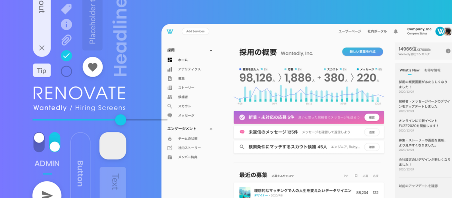 そこで、2020年9月からは Wantedly のUIに的を絞って網羅的に刷新する『リノベーション』に取り組んでいます。このリノベーションではバックエンドに極力手を加えずにUIの変更に的を絞ることで、UI/UXの統一を短期間で行うことができます。画面のデザインを刷新するときには、機能の変更や情報の追加をしたり、技術スタックの刷新やAPI改修のためにフルスクラッチで書きたくなることも多いでしょう。しかしこれらをぐっと我慢してあくまで既存のフロントエンドの UI修正に集中することで高速な改善を行います。