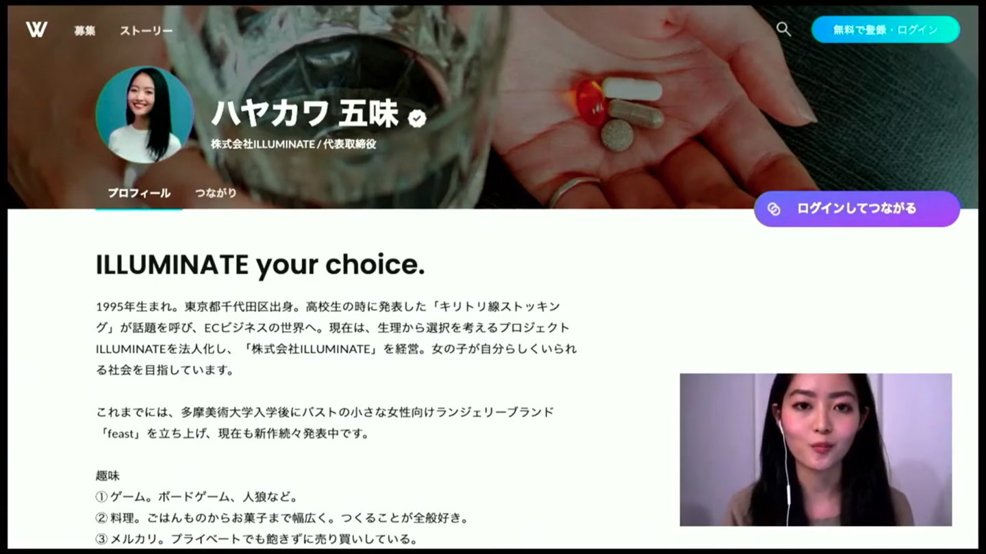 新しくなったWantedlyのプロフィールで追う、ハヤカワさんの原点 島田:新しくなったWantedlyのプロフィールには一番最初に自分のキャッチコピーや座右の銘を入れられるんですよね。ハヤカワさんのプロフィールにある 「ILLUMINATE your choice.」 について教えてください。
