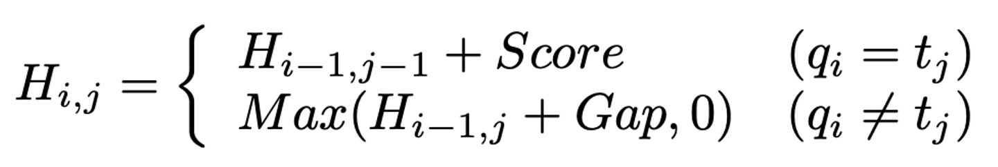 algo.FuzzyMatchV2 で実装されています。v1 とは違い編集距離をもとにスコアを計算します。アルゴリズムは Smith-Waterman 法をベースにしており、fzf では大体以下の式で Matrix が計算されます。H が DP で使う Matrix で、q はクエリ、t は検索対象文字列を示しています。