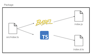 社内共通のReactコンポーネントライブラリが作られた当初は、一部のReactコンポーネントを共通化することを目的とした小さなライブラリでした。コンパイルのフローもシンプルで、 babel と tsc で、 entry となる1つのJSと型を出力したものを npm にパッケージとしてリリースしていました。