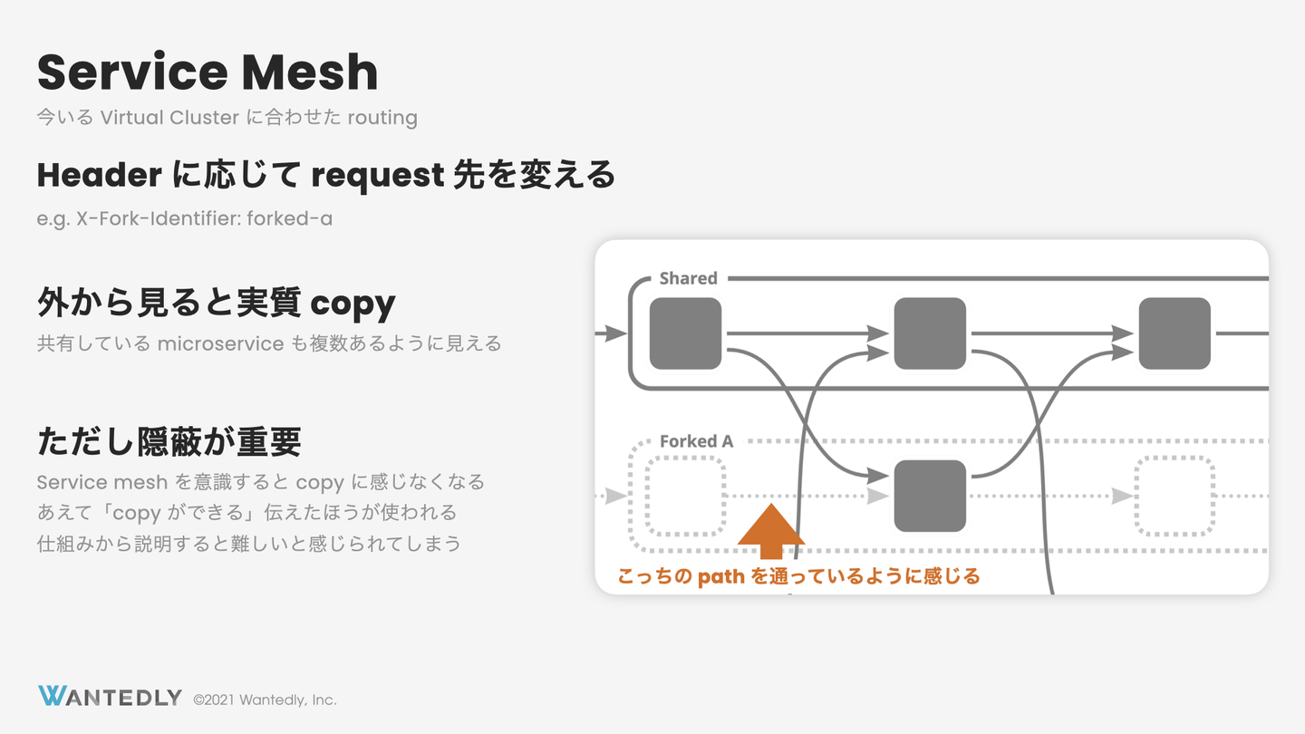 例えば上の図では Forked A は実際には2つめの microservice しか実体を持っていませんが、その実態以外の挙動は全て共用クラスタを使っています。複数の microservice を変更したい場合、一番 front に立つ microservice を変更したくなった場合も少し工夫してあげれば良さそうだと Forked B の方を見るとわかります。