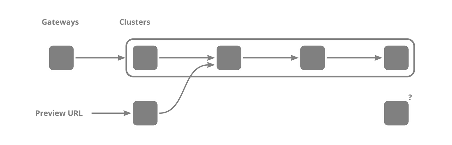 しかしながら最も後ろ側に立つ microservice の変更を preview したい場合はどうでしょうか。その microservice に直接つなげる入り口を用意しても intergation した状態での preview ができません。そうすると必要な microservice を copy したくなってきます。今回のケースだとたかだか4つの component を copy してあげれば integration した状態が手に入ります。ただ現実問題として microservice が増えてくると全ての microservice の依存関係を把握するのは簡単ではなくなってきます。したがって preview deployment を microservice でも実現しようとするともう少し良いアプローチが必要であることがわかります。
