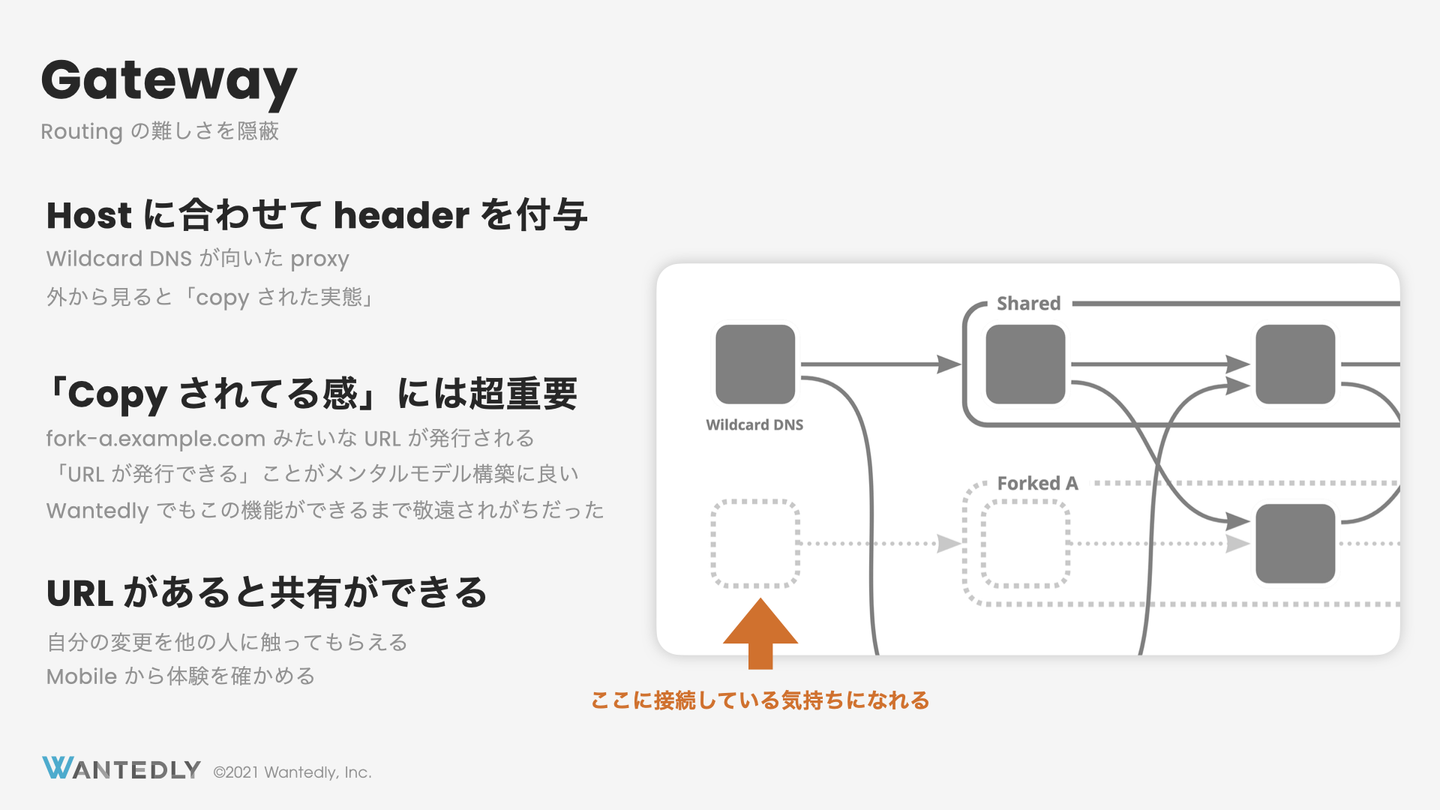 apiVersion : getambassador.io/v2 kind : Mapping metadata : labels : fork.k8s.wantedly.com/manager : default name : some - dev - wantedly - com - some - identifier namespace : fork - proxy - ambassador spec : add_request_headers : x-fork-identifier : some - identifier ambassador_id : - fork - proxy - ambassador host : some - identifier.some - dev.wantedly.com prefix : / service : https : //some - dev.wantedly.com このシンプルな Gateway という仕組みを作った経験はエンジニアとしても少し面白いものでした。技術的には Context Propagation と Service Mesh のほうが考えることが多く、Gateway は技術的には何も難しいことはありませんでした。しかしながらこれを作ってから Kubefork が圧倒的にわかりやすく使いやすいツールになりました。良い Developer eXperience を得るために技術的な難しさは必ずしも必須項目ではないわけです。
