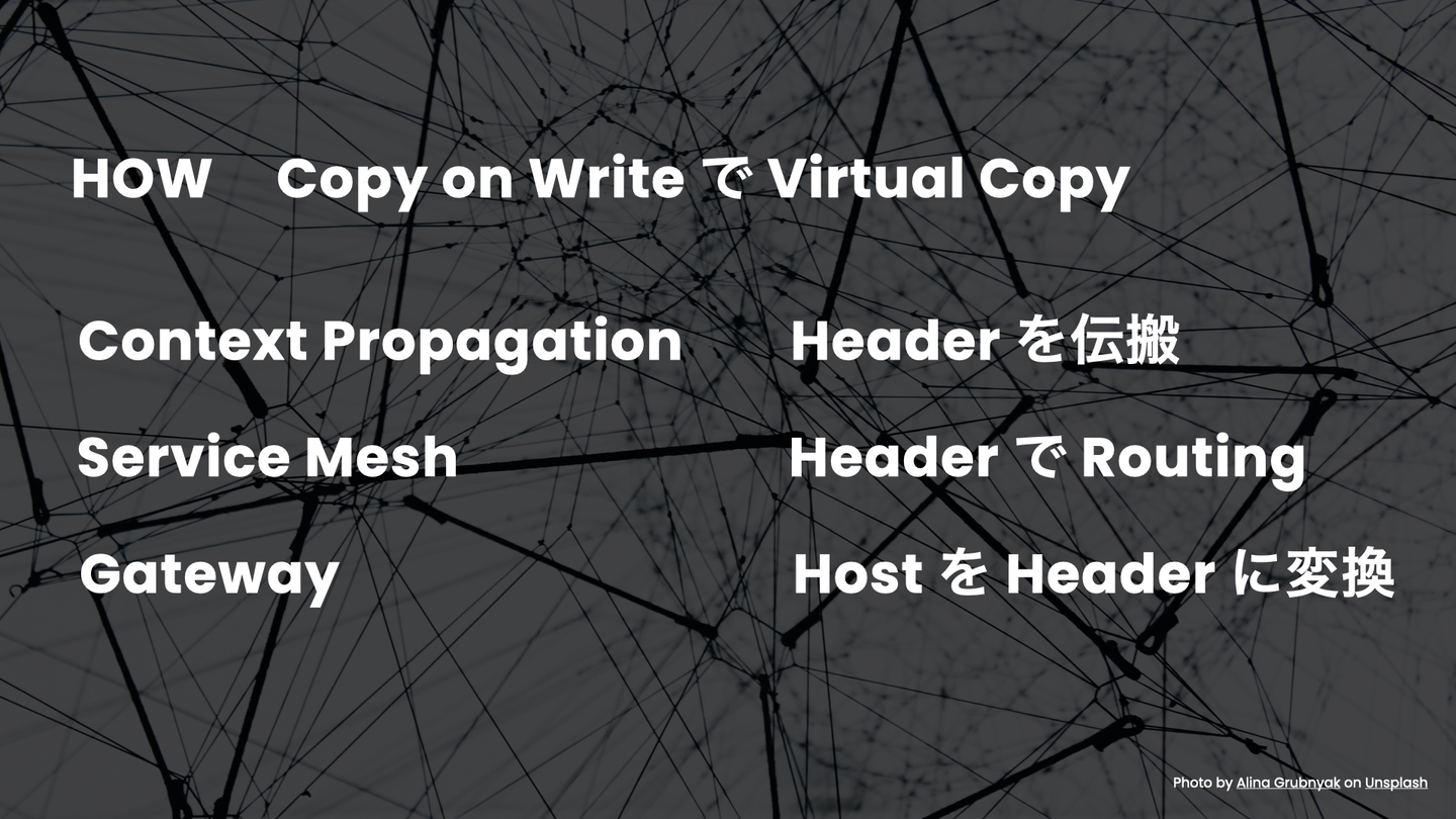 具体的に言うと X-Fork-Identifer: fork-a のような header 付きで request の処理中に別の microservice に通信を行う場合は必ず X-Fork-Identifer: fork-a を付けるという仕組みです。