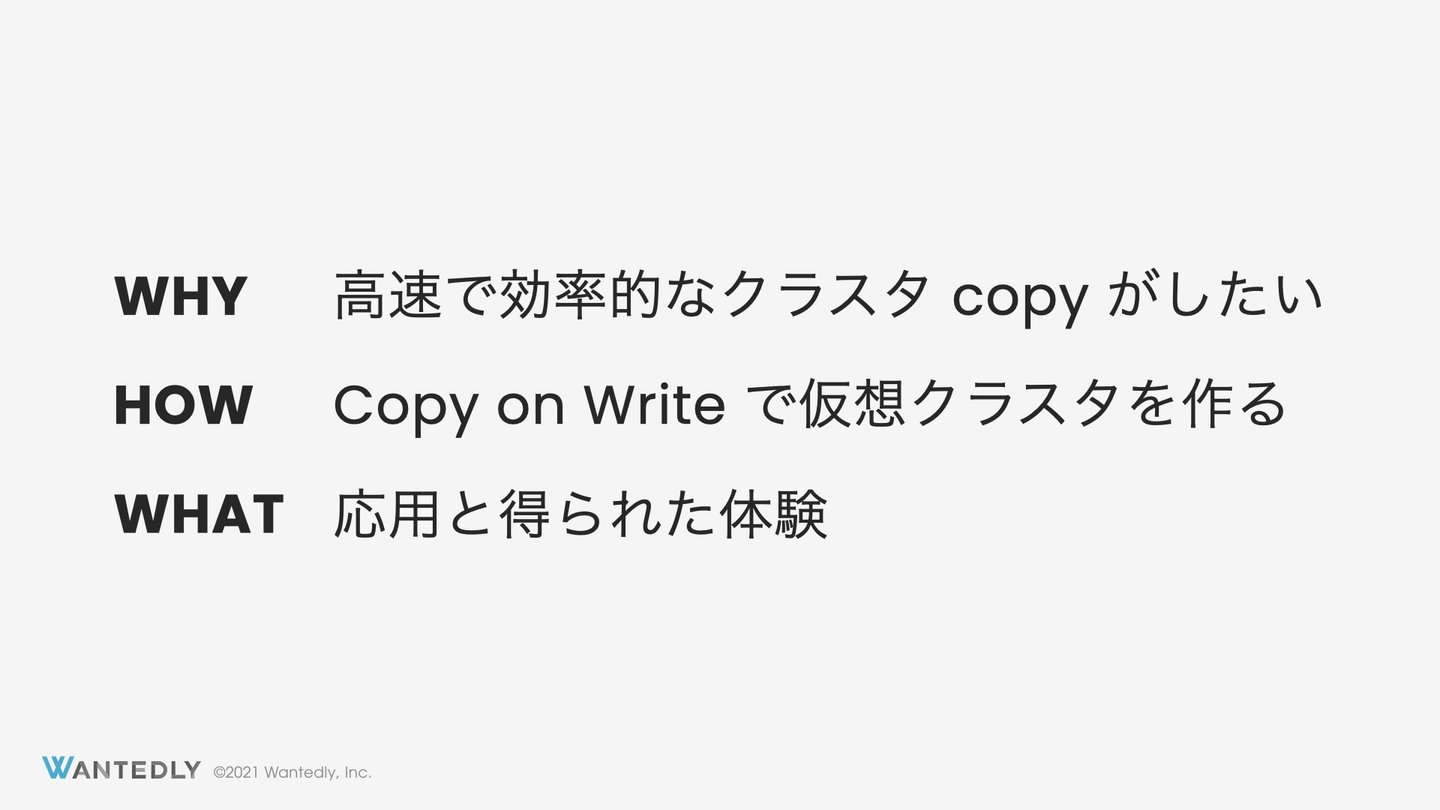 How Copy on Write で Virtual Copy ここまでで「Kubernetes Cluster の copy ができれば嬉しい状況がある」という確認を行いました。ここからは「どうやって copy を作るのか」について考えます。当然ながら真面目に Kubernetes Cluster を copy すると計算資源も費用も大量に費やすことになり現実的ではありません。そこで必要な部分だけ copy する Copy on Write 方式を考えます。