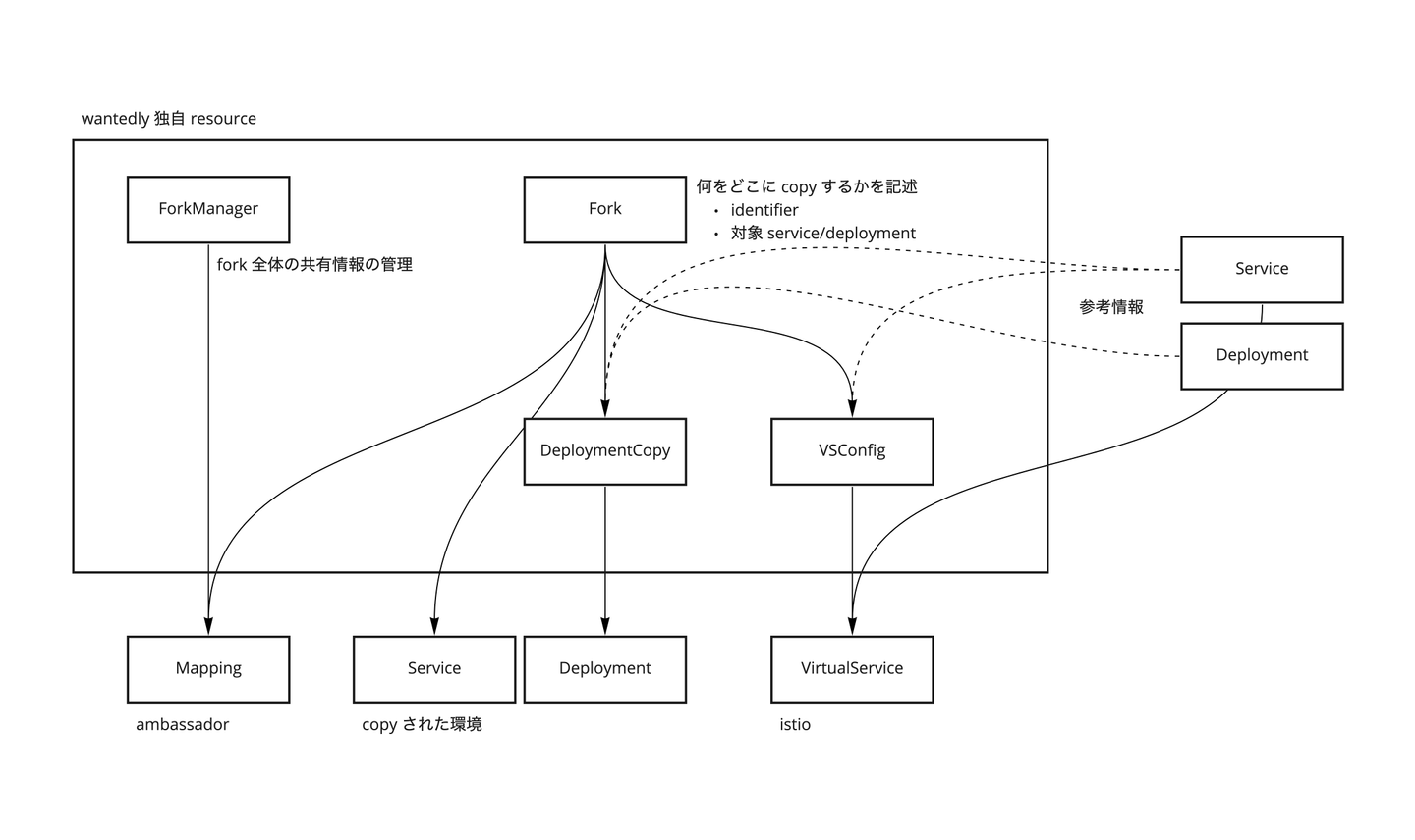 apiVersion : vsconfig.k8s.wantedly.com/v1beta1 kind : Fork metadata : name : wantedly - some - identifier namespace : wantedly spec : identifier : some - identifier manager : fork - proxy - ambassador/default services : selector : matchLabels : role : web deployments : selector : matchLabels : newrelic : "true" template : metadata : labels : app : some - identifier role : fork annotations : wantedly.com/deploy-target : "false" spec : containers : - image : example : tag name : wantedly この一つの resource を作るだけで前述の Ambassador の Mapping を含む必要な resource を全て作ってくれるようになっています。