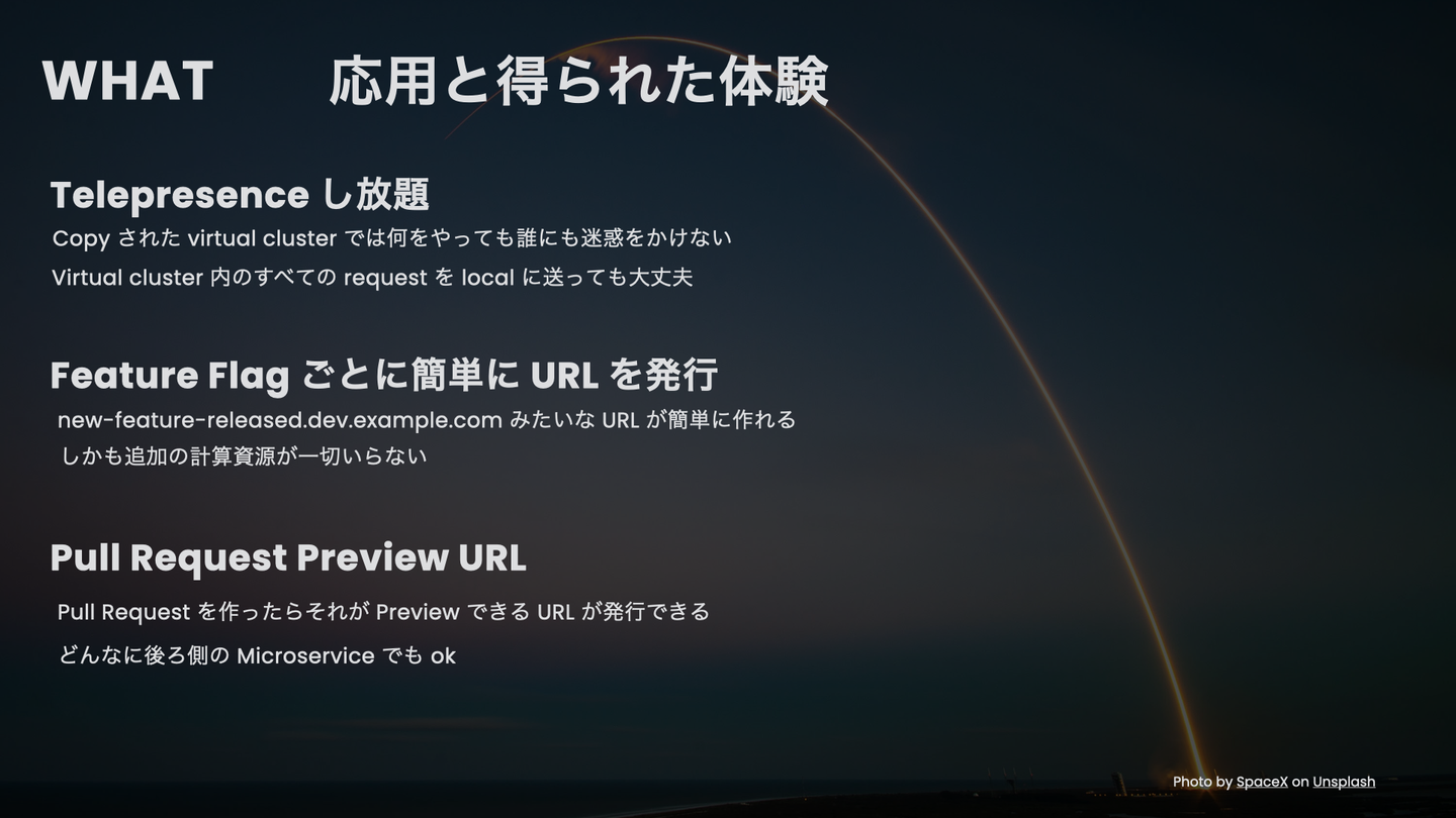Context Propagation, Service Mesh, Gateway の3つの基盤を組み上げることで、Kubernetes を効率的に copy するという体験を提供することができます。これを実現することにより、Telepresence や Preview Deployment などマイクロサービスでは導入が難しくなってしまったツール/基盤を提供できるようになります。特に示した Context Propagation は Virtual Cluster という体験を完全に抜きにしてもかなり便利な基盤なのでぜひ作ってみてほしいなと考えています。