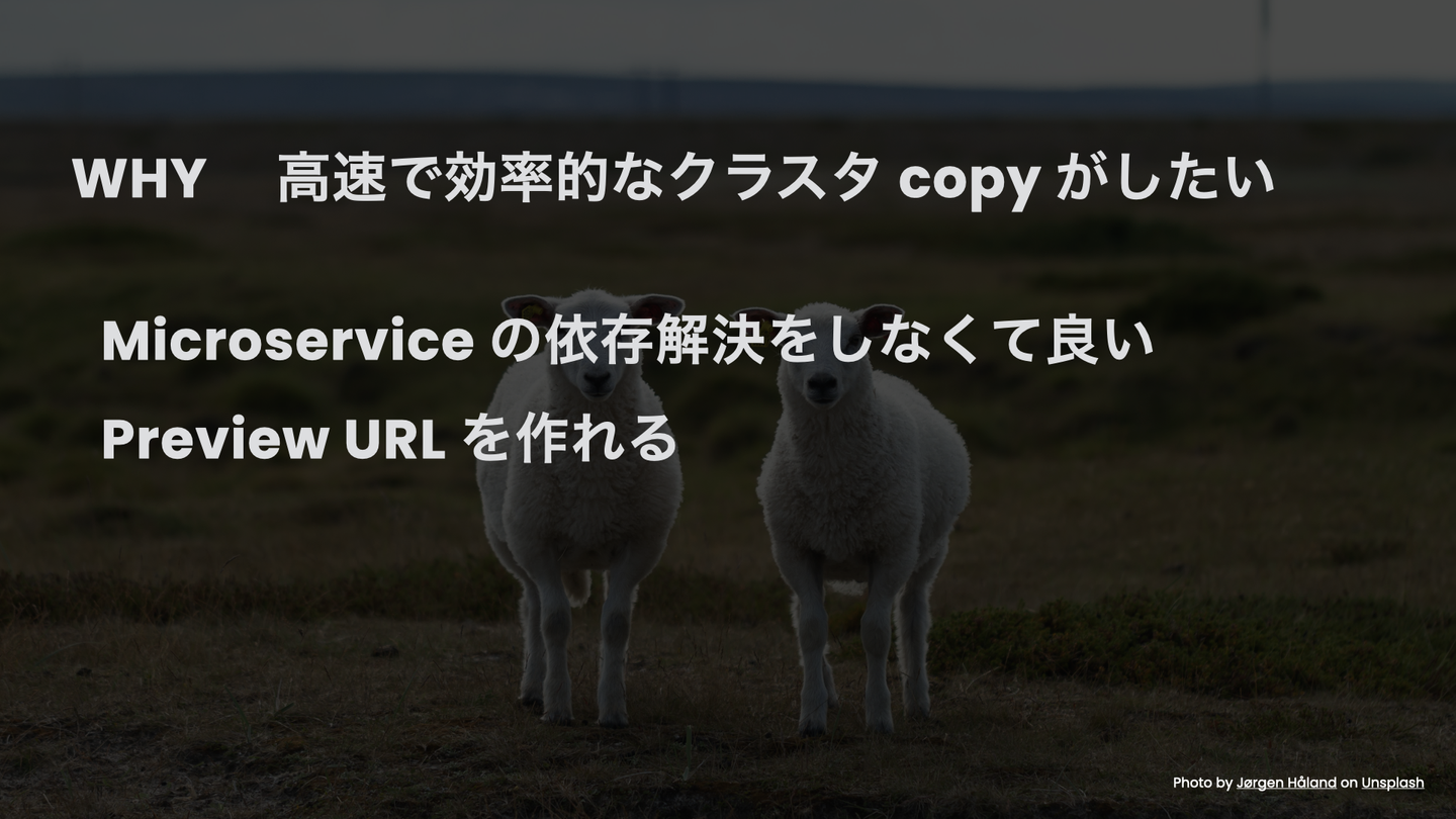 Kubernetes Cluster 自体を copy すれば ok! もう少し良いアプローチと書きましたが我々のアイデアそれ自体はそんなに頭の良いものではありません。全部一気に copy してしまえば勝手に依存関係が満たされたものが用意できるし、そこで一部の microservice だけ自分のブランチのものに置き換えれば preview 環境ができあがります。この copy するという考えやそれに至る道程については CloudNative Days Tokyo 2020 でのトークでも詳しく話しているので興味がある方はぜひご覧ください