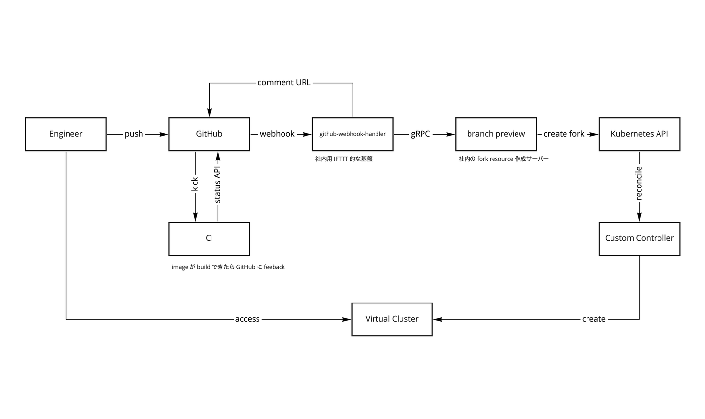 Pull Request Preview URL ここでやっとタイトルのユースケースが登場します。Copy on Write なので多少アグレッシブに Virtual Cluster を発行してしまっても大丈夫です。そこでコードが push されるたびに適切な fork resource を作成するようにすると、どんなに後ろ側の Microservice を変更したときでもそこにつなげる URL を発行できます。