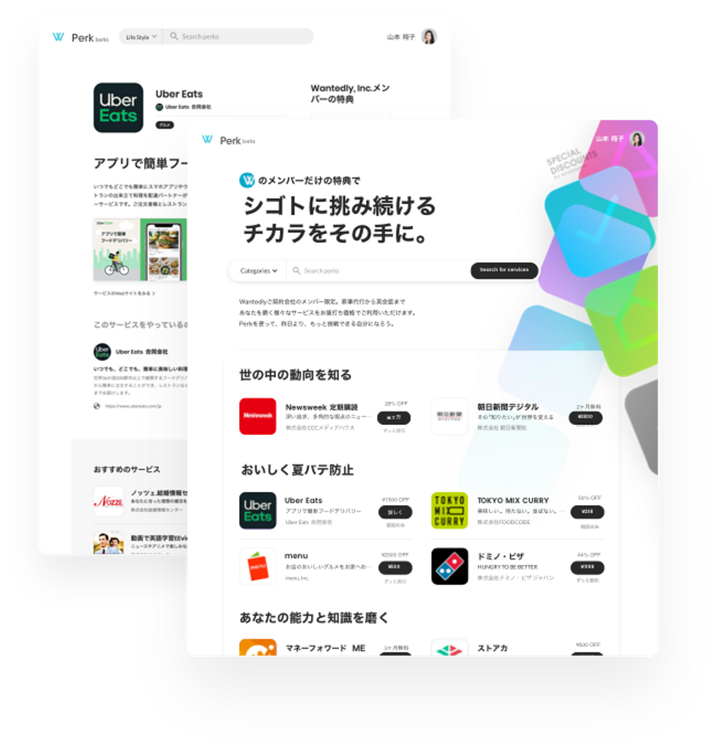 Perkはウォンテッドリーが提供する福利厚生サービスです。気軽に使える特典が1000件以上。毎日の「うれしい」を増やし、従業員のモチベーション向上に貢献します。