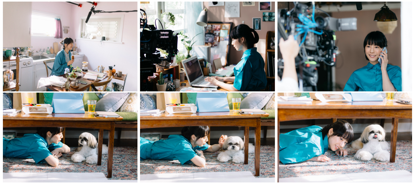 朝、ベッドから起きる場面でも、リビングでソファに座っている時も、ヨガをしている時にも、夏帆さんの足元にぴったりと寄り添うのは、夏帆さんの愛犬役として登場したシーズー犬の華丸くん。夏帆さんも華丸くんとのご対面には思わずにっこり。ラグの上に寝転んだ夏帆さんが、ごはんをおいしそうに食べる華丸くんをやさしく微笑みながら見守るシーンや、至近距離で見つめ合うシーンなど、どの場面も夏帆さんと華丸くんのかわいさに癒され、スタッフも思わず顔がほころびました。