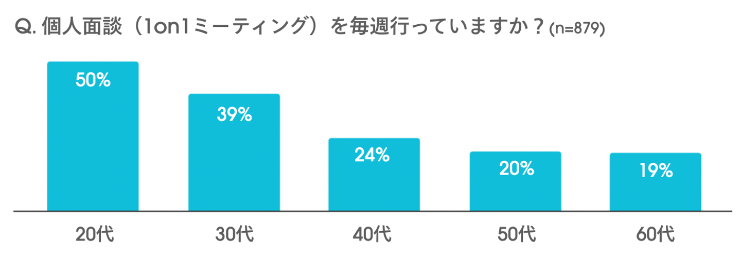 つながり管理アプリ「Wantedly People」にて879名を対象に個人面談(1on1ミーティング)を毎週行っているかどうか聞いた調査では若年層ほど実施割合が高く、20代は50%と、50代の2.5倍の人が実施しているという結果が得られました。今まで半年ないしは年に一回程度しか無い、というのが当たり前だったマネージャーとメンバーとの対話の場は、新しい世代にとって当たり前の物になってきていることが伺えます。