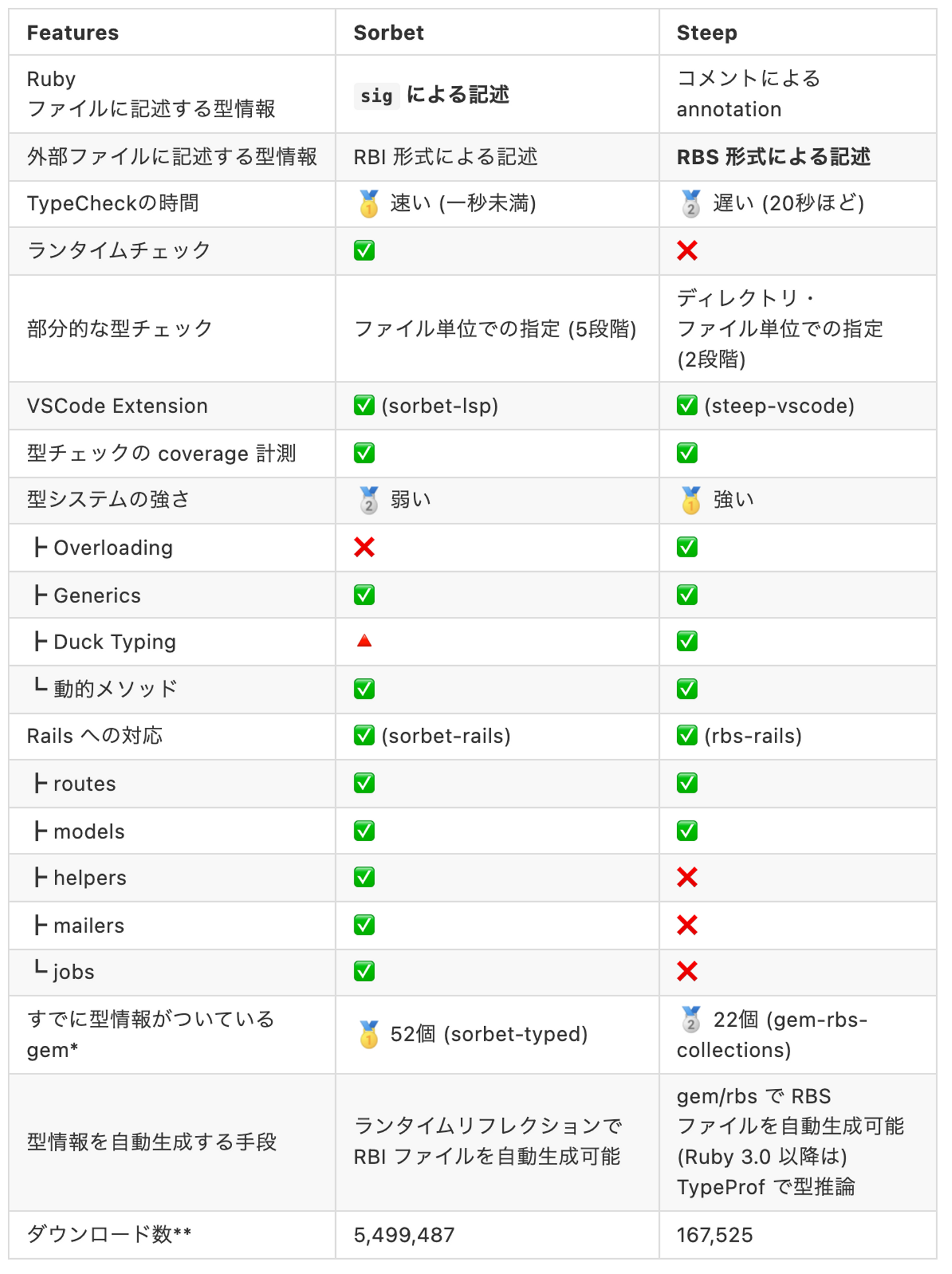 以下の表は、Sorbet と Steep それぞれについて、型チェッカーの仕様や周辺ツールの整備状況などを簡単にまとめたものになります。