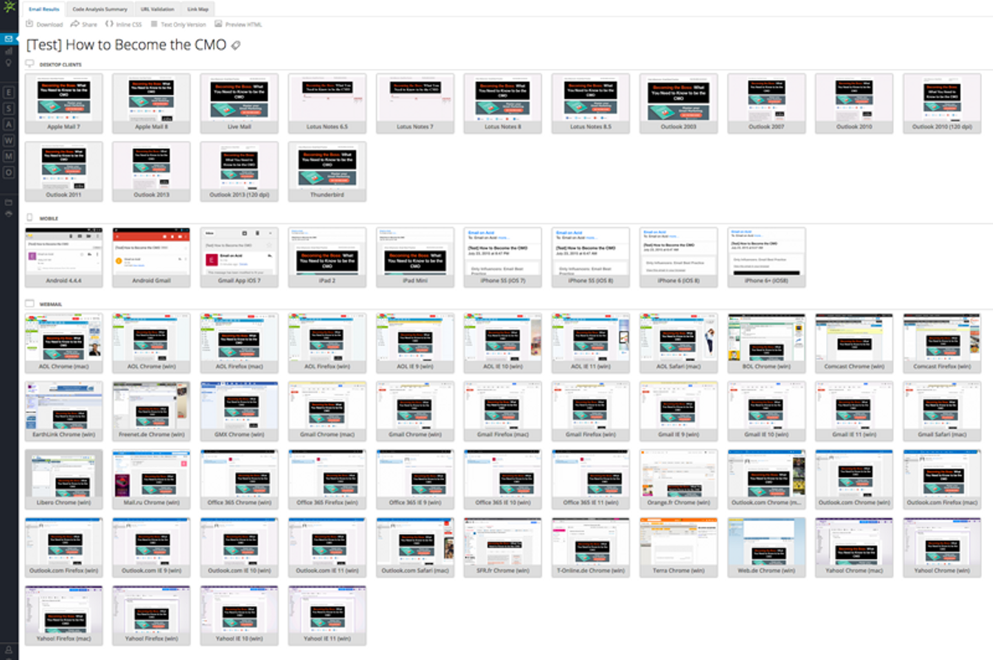 また、世の中にはメールのプレビューサービスというのがあって、色んなメーラーでどんな感じになるか確認できます。Litmus や Email on Acid がメジャーで、UIはLitmusの方がイケてますが、Acidの方が安いのと、最初7日間は無料で使えるというので今回はこちらを利用しました。