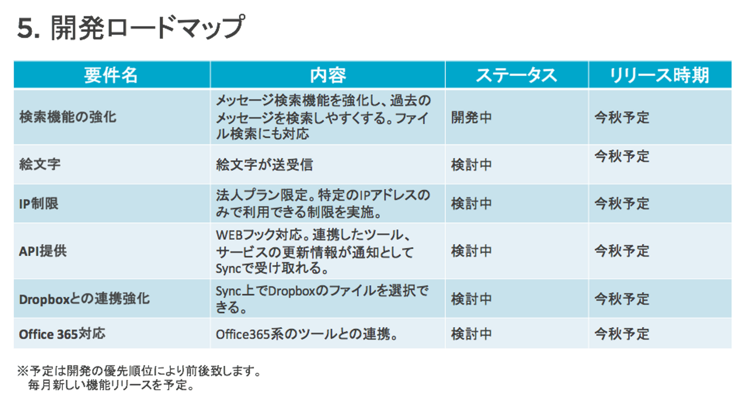 営業はユーザのニーズをヒアリングする機会でもあります。Syncのロードマップを見せて、それぞれの新機能の提供価値を説明して、リアクションを確認します。リアクションのよいものは開発にフィードバックし優先順位を上げて、実際に開発にとりかかっています。