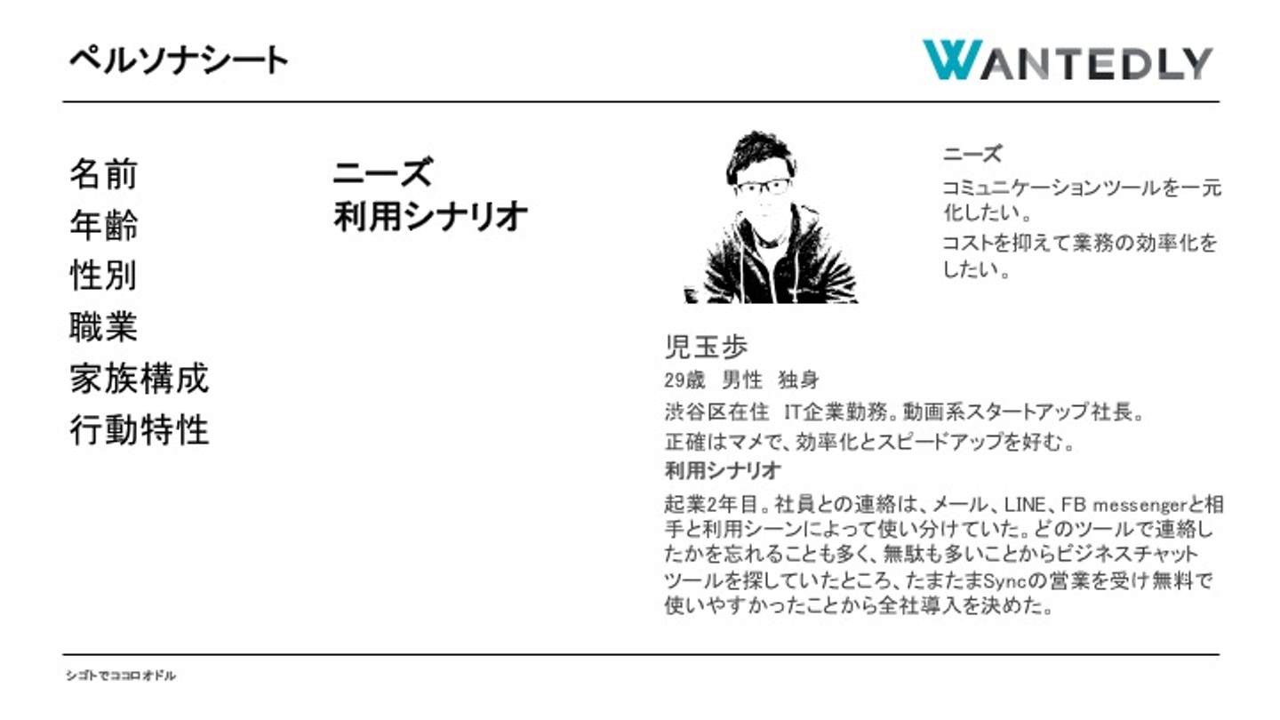 ビジネスチャットSyncを利用するターゲットユーザとしては、「外出の多いビジネスマン」や「オフィスが複数拠点あり情報伝達がうまくいっていない制作会社に勤めているエンジニア」等が考えられますが、これだけでマーケティングの施策を実施するのは認識のずれが生じて危険です。開発やマーケティングメンバーの中には、実際に営業を経験したことがないメンバーがいたりするので、ペルソナを作成し、ユーザ像を具体的に想定できるようにすることが大事です。