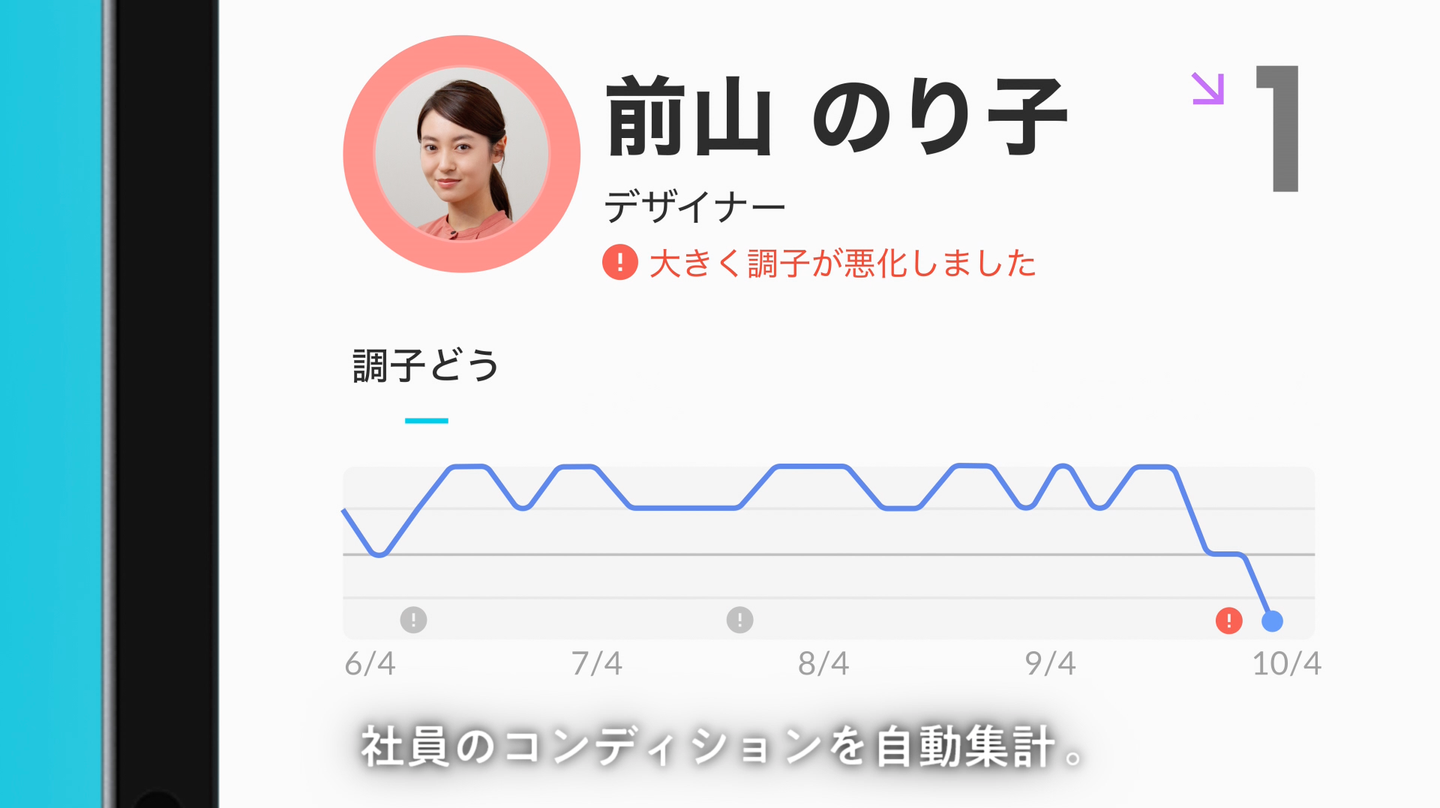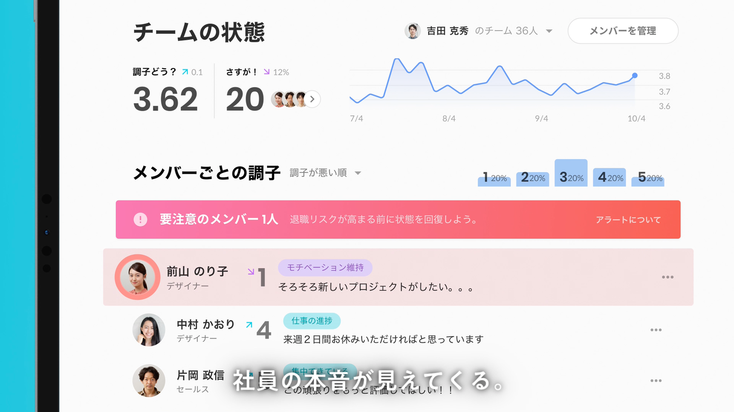 マネージャーが見ることができる管理画面に、チームメンバーの調子が一覧表示されます。メンバーひとりひとりの調子の推移も確認することができます。