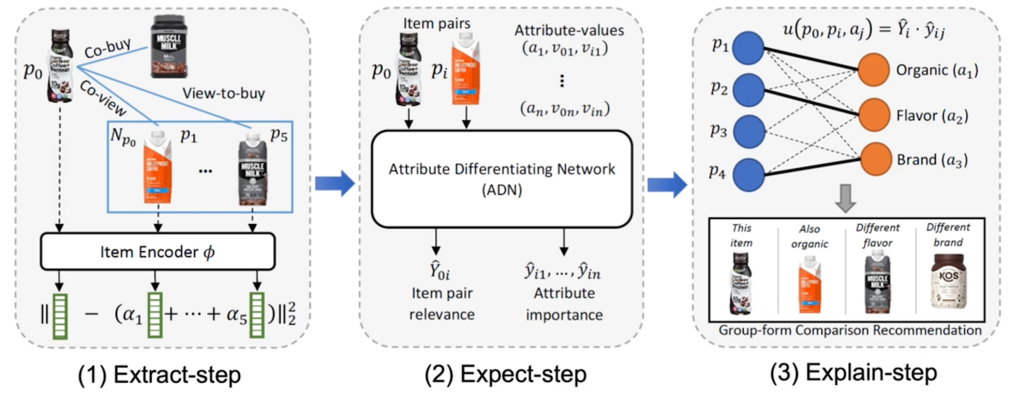 Expect-step: アイテムペアと、そのペアに付随する属性情報を入力に、アイテムペアの関連度と属性情報の重要度を出力する