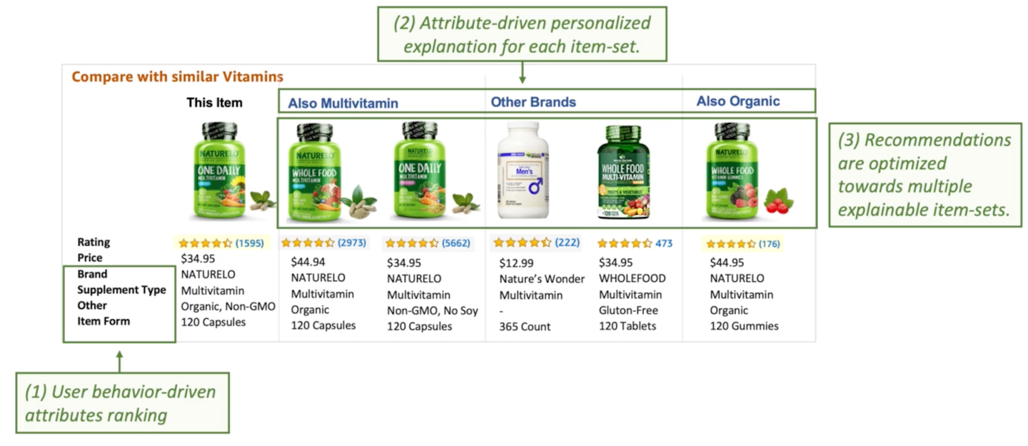 一つ目はReal-World Concernsのセッションにて発表された、AmazonのECサイトの推薦事例を紹介します。この発表では、アイテムの属性(※後述)情報を考慮した、説明性のある関連アイテムの推薦方法を提案しています。