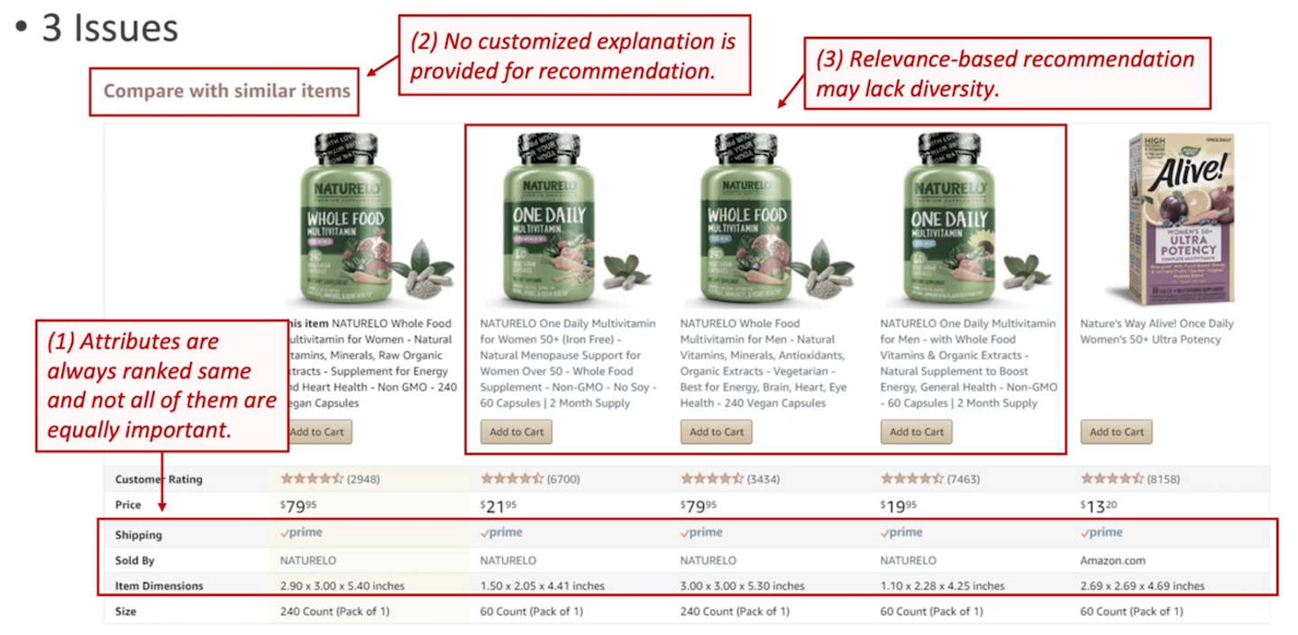 具体的に、属性情報を使うとどのように関連アイテムの推薦を改善できるのか、Amazonの推薦UIを例に説明しています。