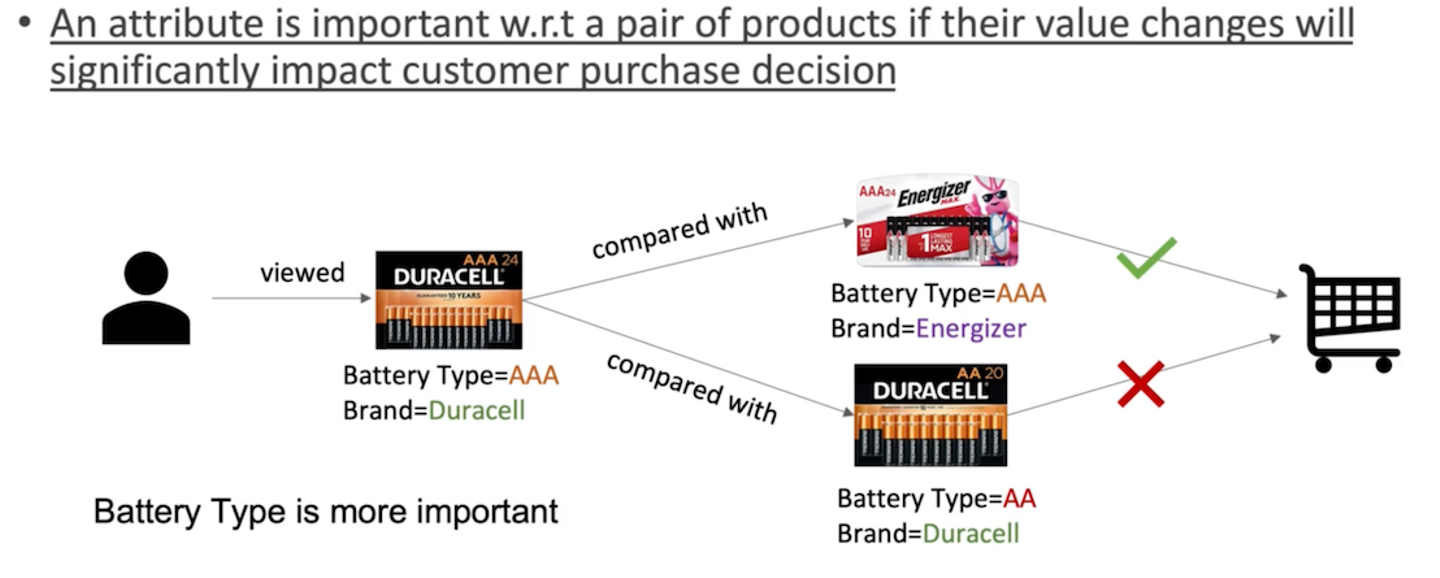 上記の問題を解決するために、筆者らは”重要な属性が一致しない限り、類似アイテムは購入しない"という仮定を元に、ユーザの行動から属性がどれほど商品購買に寄与するか重要度を割り出すというアイディアを提案します。