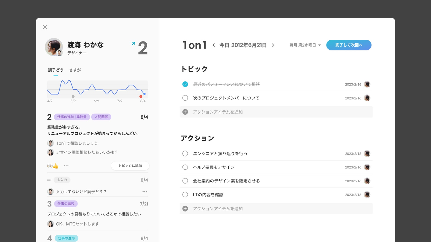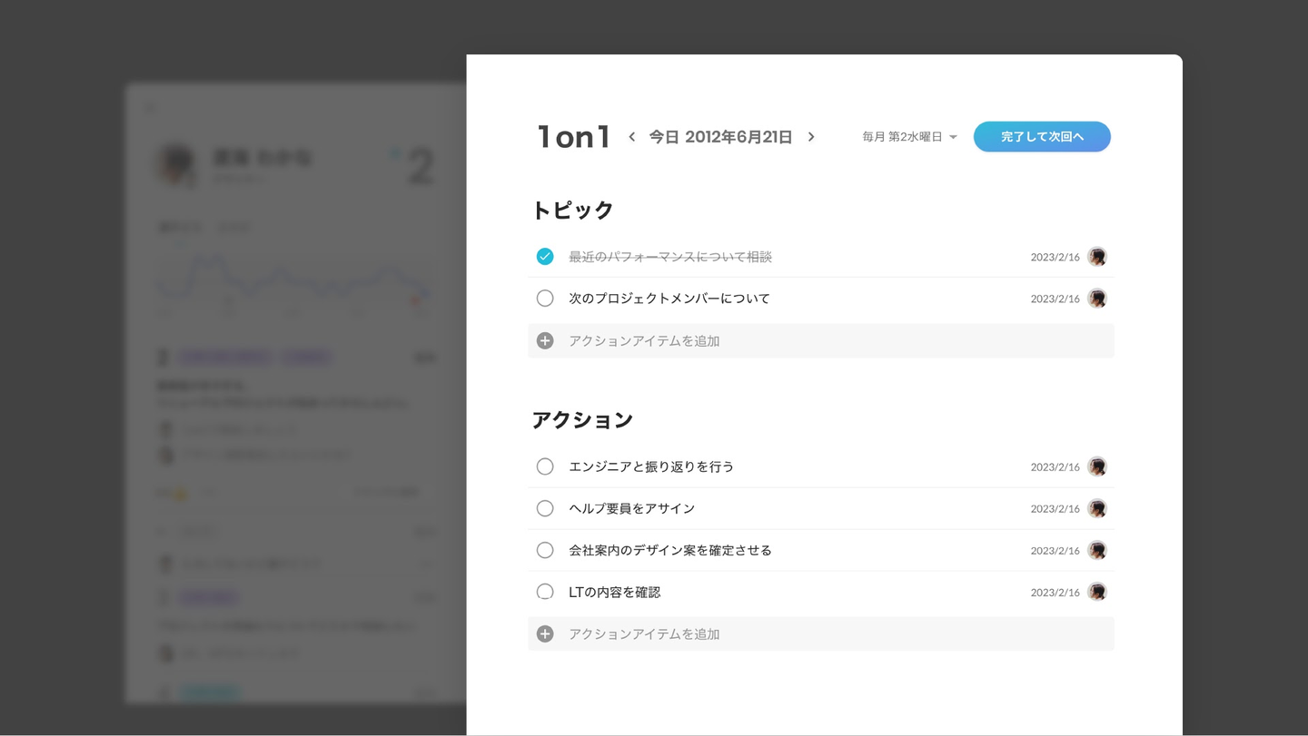 1on1 画面で完了ボタンを押すと同時に、設定した頻度で次回の 1on1 がセットされます。ありがちな 1on1の設定忘れを防ぐことができます。