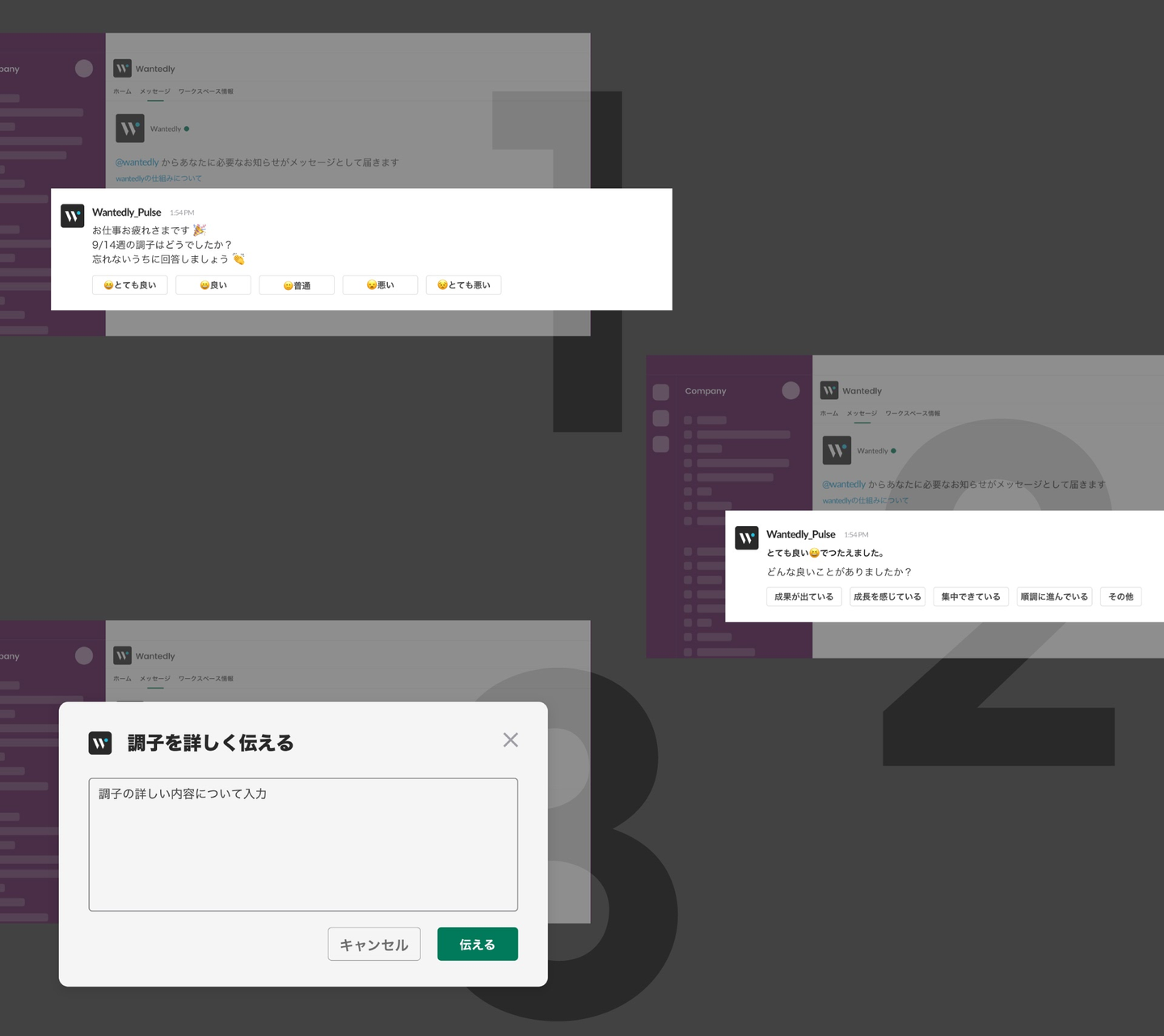 マネージャーとメンバーのみが見られる 1on1 画面に、メンバーが回答した「調子どう?」の回答した内容が反映されます。現在上がり調子か下がり調子か、どれだけの期間それが続いているのか、といった点も直感的に把握できます。1on1 画面にはSlack内の「Wantedly」チャンネルよりアクセスできます。