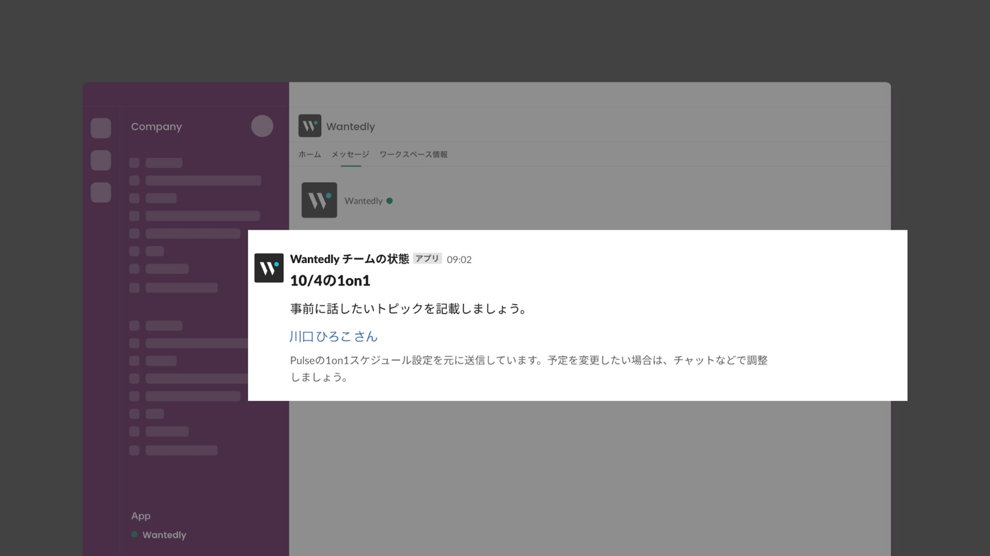 1on1 機能によってマネージャーは各メンバーとの間だけで共有される画面を通し、週次サーベイ「調子どう?」の結果を元にしたトピックの設定、ネクストアクションの管理、そして定期的な 1on1 のスケジューリング等を行うことができます。1on1 当日になるとSlackにリマインドが通知され、継続して行うことが重要な1on1 の浸透と運用がスムーズに行えます。