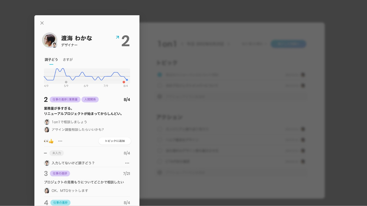 「調子どう?」の結果や日々の業務の中で感じること等を元に、次の 1on1 で話したい「トピック」をマネージャーとメンバーがそれぞれ事前に入力できます。1on1 で話す中で生まれた「アクション」を入力でき、認識のずれや、忘れてしまうこと無く課題解決に向けた一歩を踏み出すことができます。
