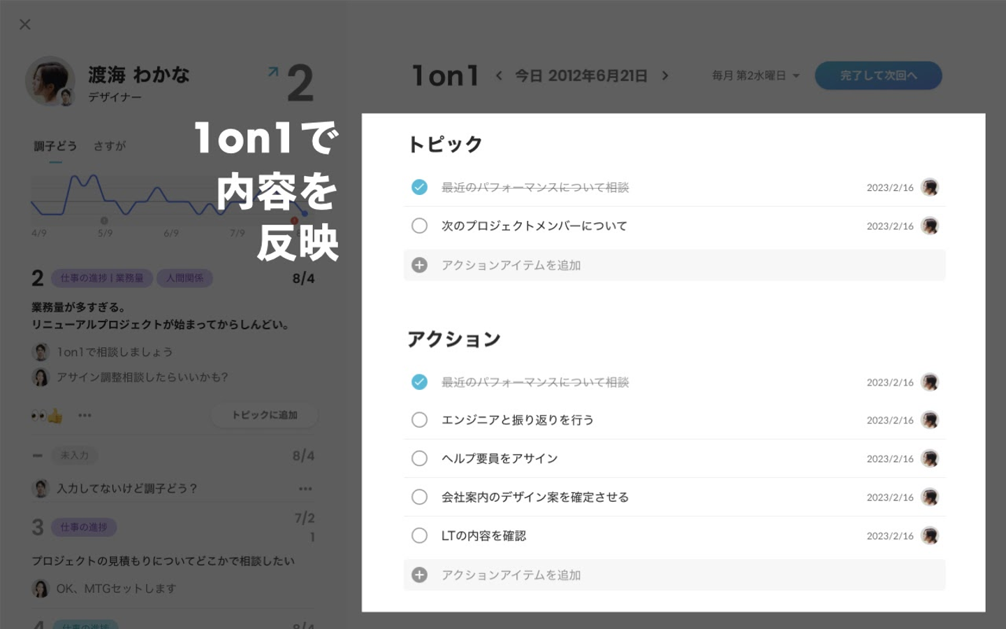 「完了して次回へ」を押して、次回の1on1をセットします。残っているトピックは持ち越されます。