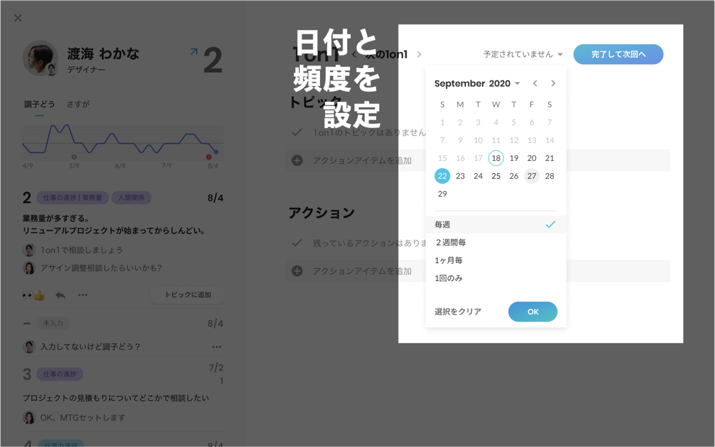 また、頻度を毎週、2週間毎か、1ヶ月毎から選べ、自動で日付設定できます。決まったスケジュールで1on1の実施ができ、習慣化を助けます。
