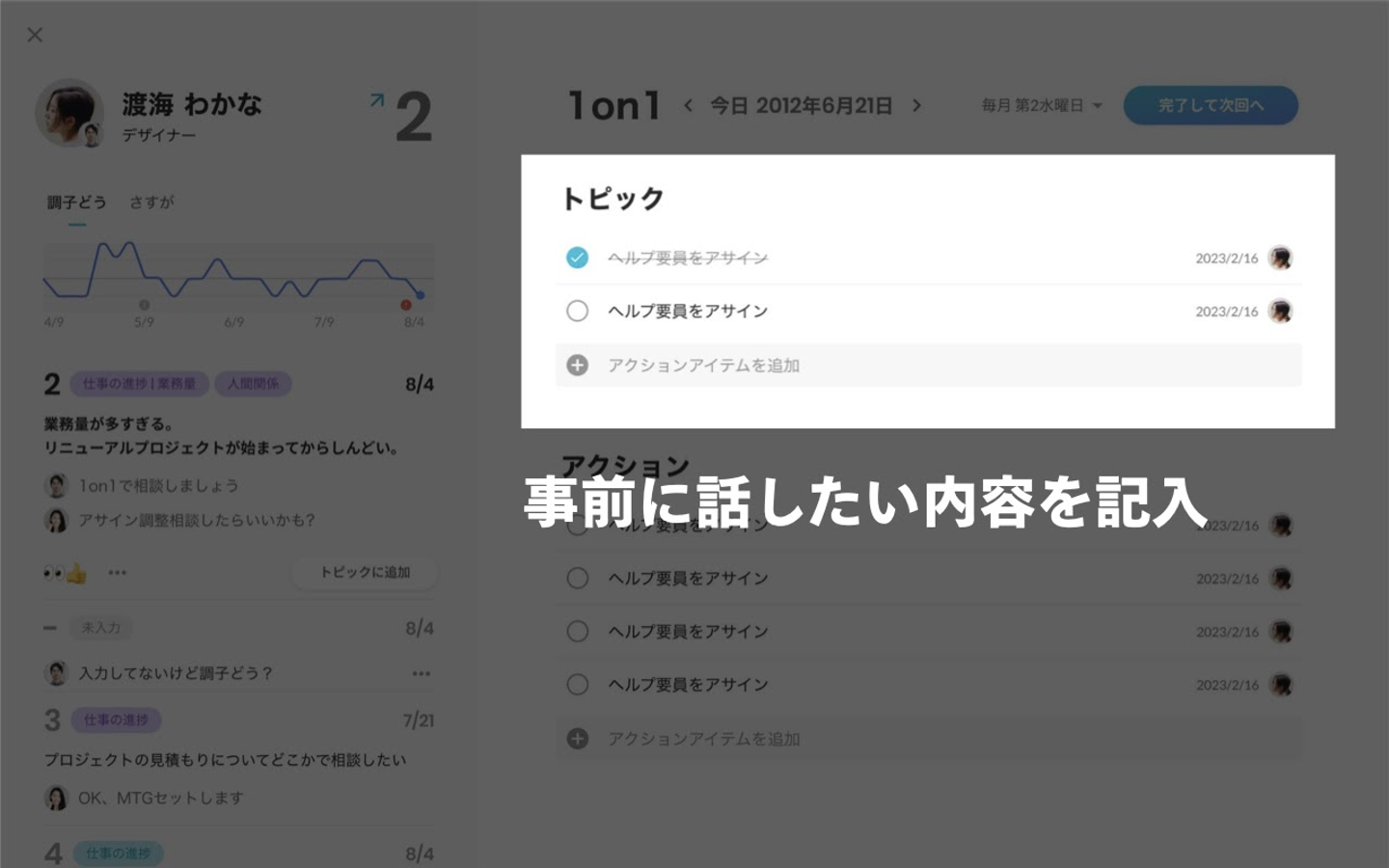 リーダーとメンバーそれぞれが、次回の1on1で話したいトピックをいつでも入力できます。事前に記載しておくことで、重要なトピックの話し忘れを防止します。