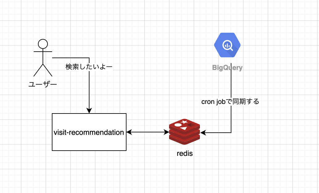 なぜ、Redisにデータを同期しておくかというとユーザーの検索リクエスト時に毎回BigQueryに問い合わせるのは遅いのでRedisに同期しておき、高速にレスポンスを返せるようにしています。