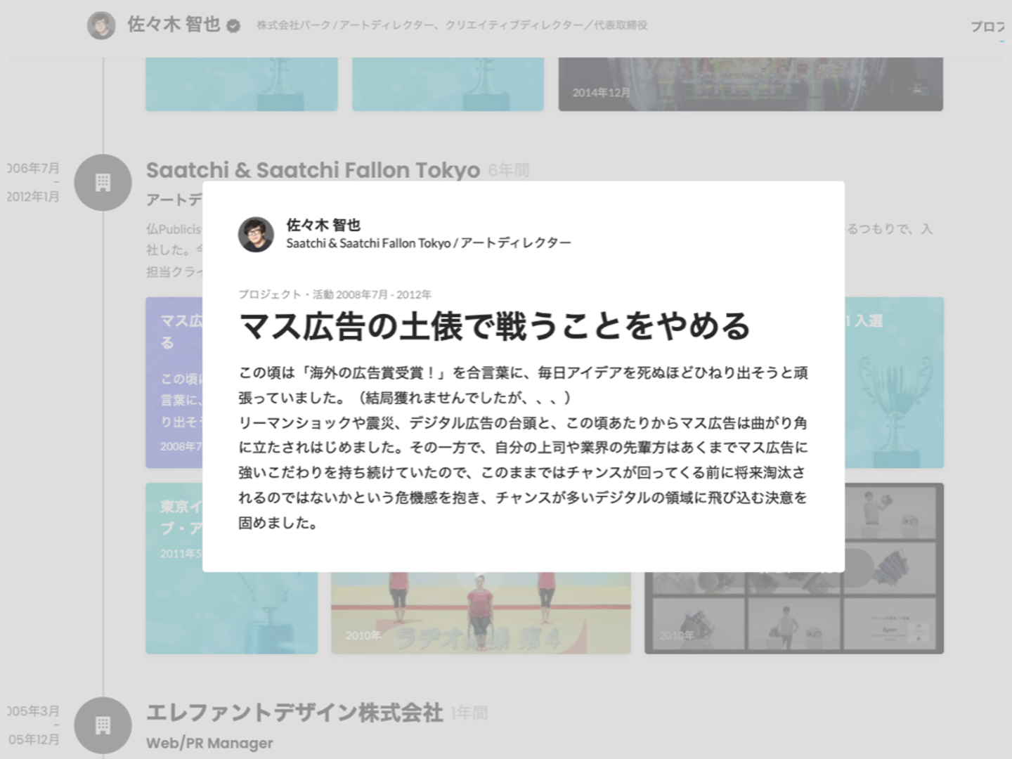 「その他プロジェクトカード」は画像も数値もURLも無いけれど、これは伝えたい!みたいなときに便利なカードです。テキストのみで伝えることができます。こちらはPARKの佐々木智也さんのプロフィール。