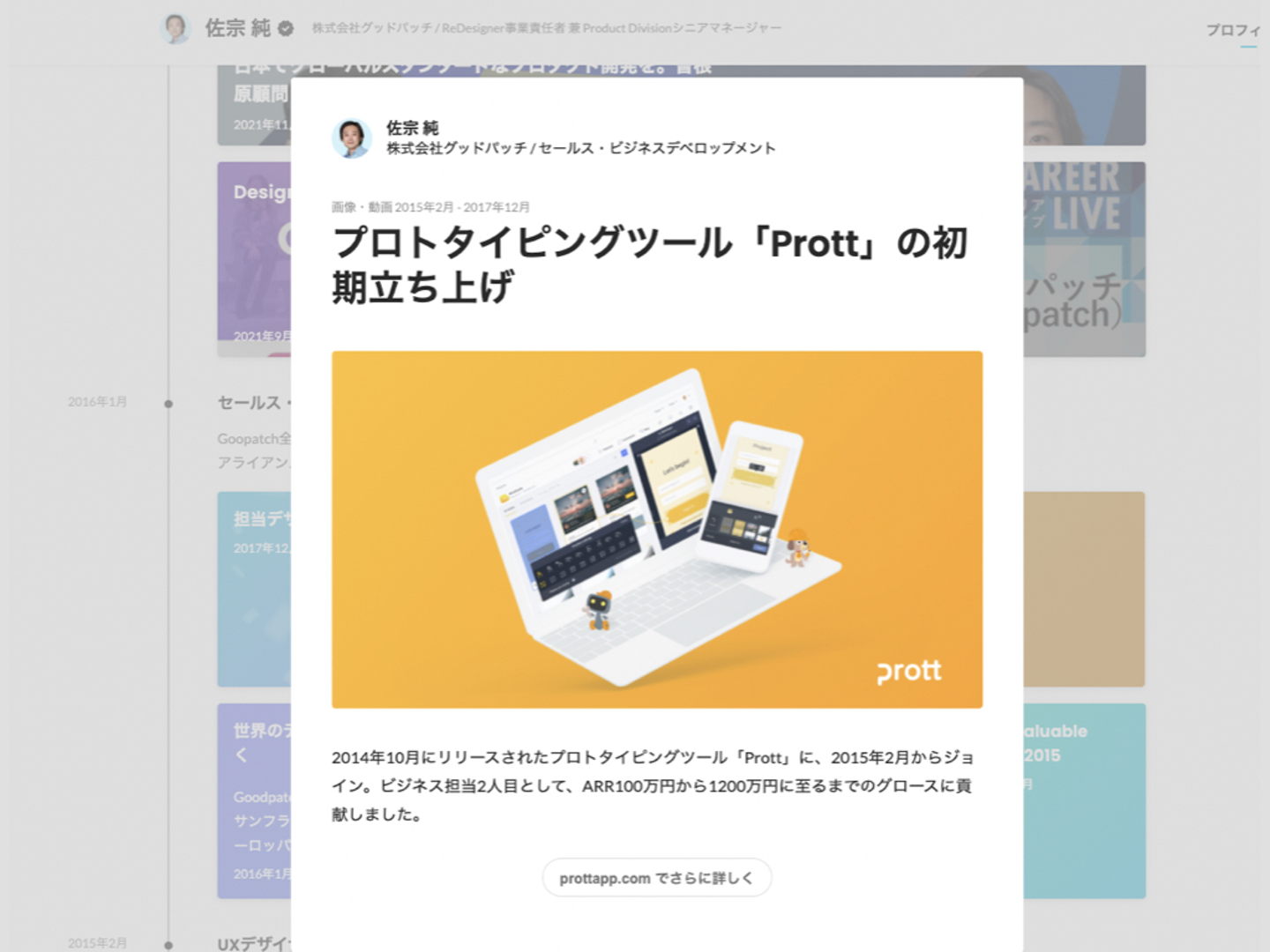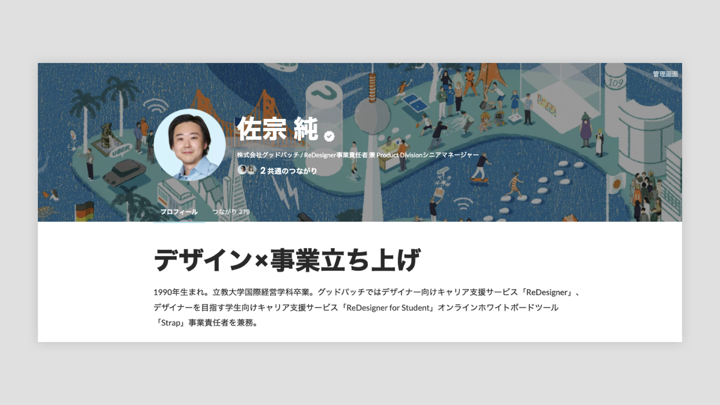 プロフィール写真は証明写真よりも、自分らしさが伝わるものがおすすめ。カバー画像もセットで設定するとあなたらしさがより伝わります。グッドパッチの佐宗さんのプロフィールのトップを見てみましょう。