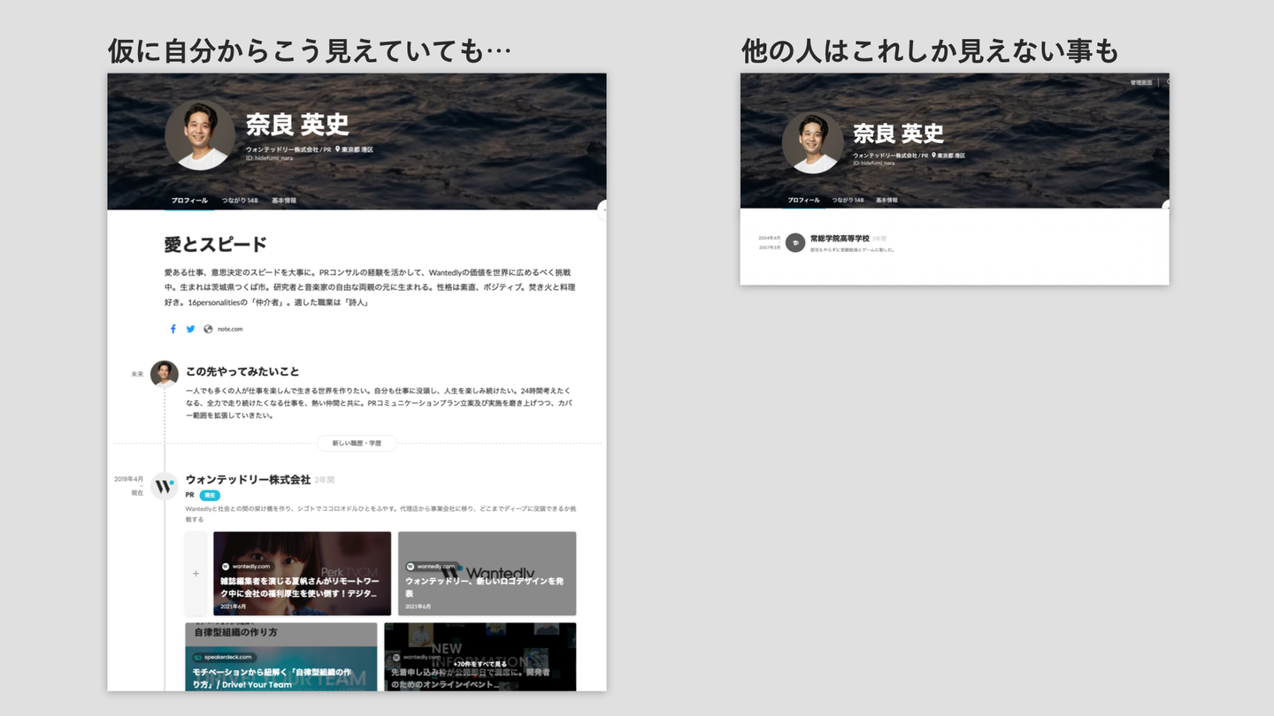 たまになのですが「プロフィール気合い入れて作りました!見てください!」と言われてみると「おや何も見れないぞ…?」となることがあります。Wantedlyのプロフィールは、コンテンツごとに公開範囲を設定でき、「誰がプロフィールを見ることができるのか?」をコントロールできます。公開範囲の設定によっては他の人からほとんど見えない、なんてこともあるので要チェックです
