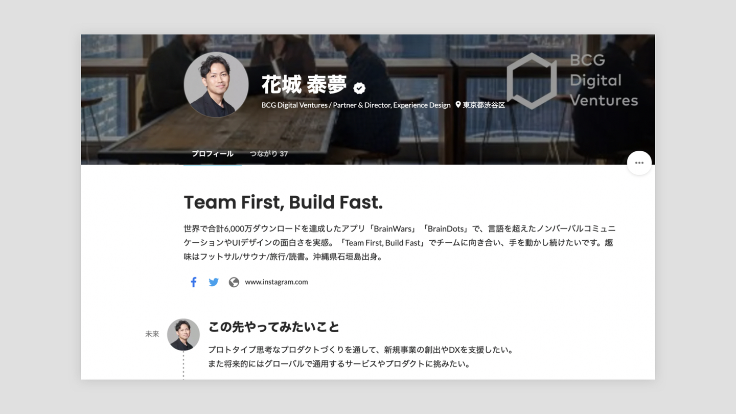 ここは「1分くらいでカジュアルに自己紹介する時何を話すかな?」という視点で今力を入れていることや、自分のパーソナリティも伝わる趣味等の情報をコンパクトに書くのがおすすめ。Twitterのプロフ文くらいのボリュームが近いですね。こちらはBCG Digital Ventures 花城さんのプロフィール。