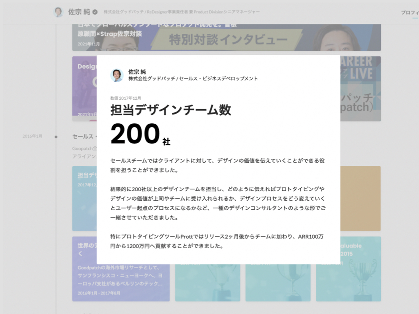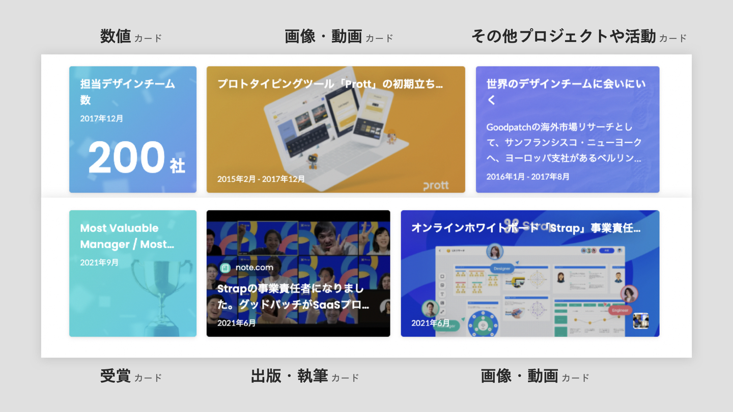 またグッドパッチ佐宗さんのプロフィールを見てみましょう。色々な種類のカードを使っていますね。