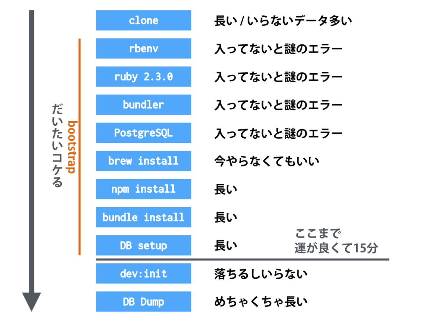 上記のbootstrapスクリプトがbundle installやnpm installなどをやってくれますが、これの実行が非常に遅く、少し想定と異なる環境が違うPCで実行するとすぐに動かなくなっていました。また、途中で落ちてもエラーメッセージが適切でなく、初めて使うと戸惑うことが多くある状態でした。