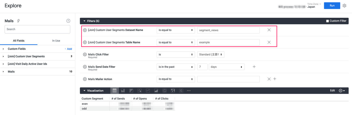 `users`データセット名・テーブル名を Explore 上で指定することで、このビューに対応する (LookML としての) ビューが Explore 内で結合され、上の画像の出力が得られます。