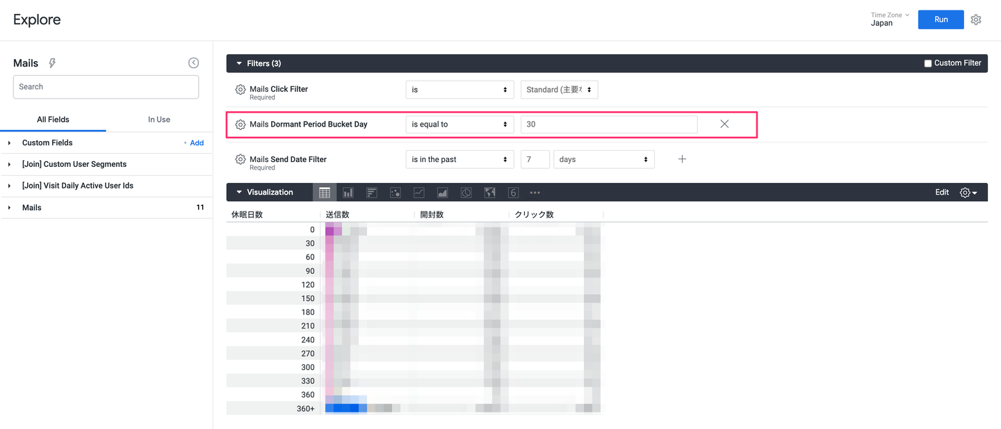 メール受信ユーザの休眠期間を任意の日数 (上図では30日) ごとに分割してそれぞれの指標を確認できるようにしています。休眠期間別の分析はクエリが複雑になりがちなため、Looker 上で行えるようになることで効率性に関してインパクトがありました。