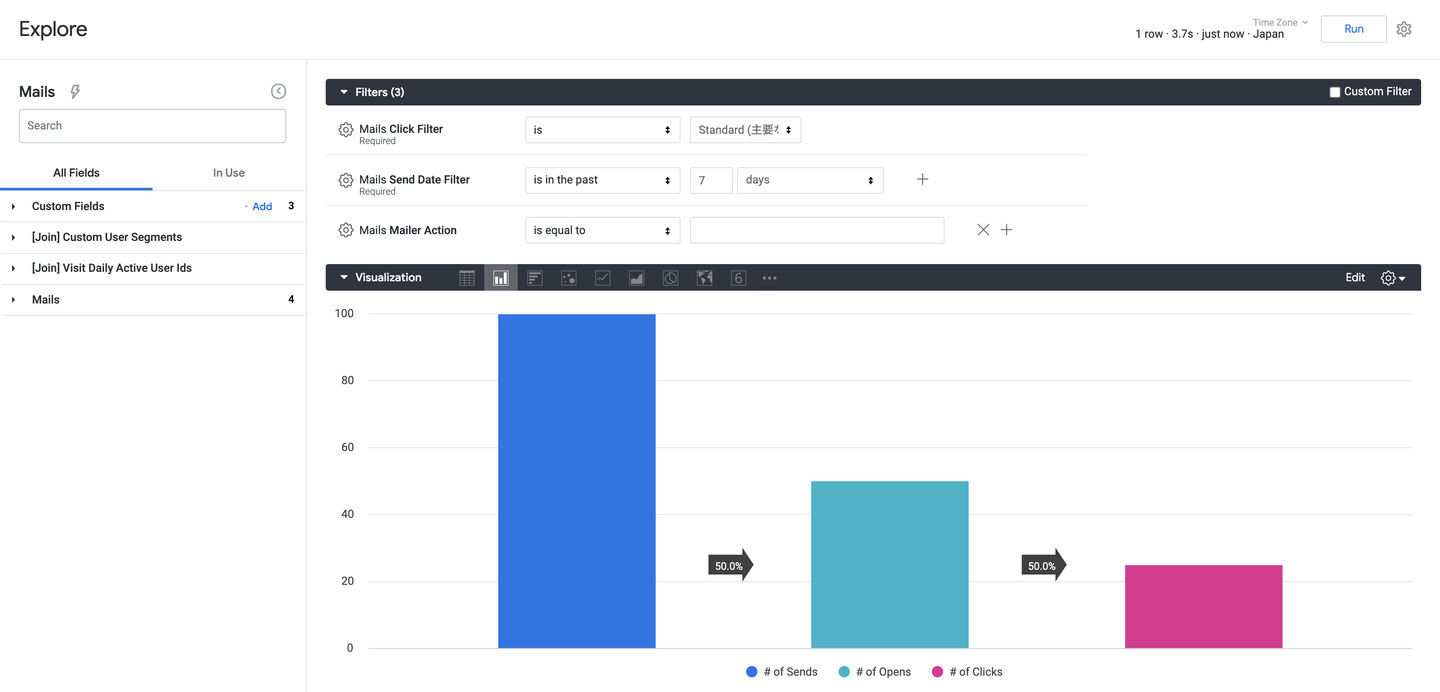 BigQuery に格納されているメールのアクションログをもとに LookML でビューを作成し、標準化すべき指標を以下のように実装します。