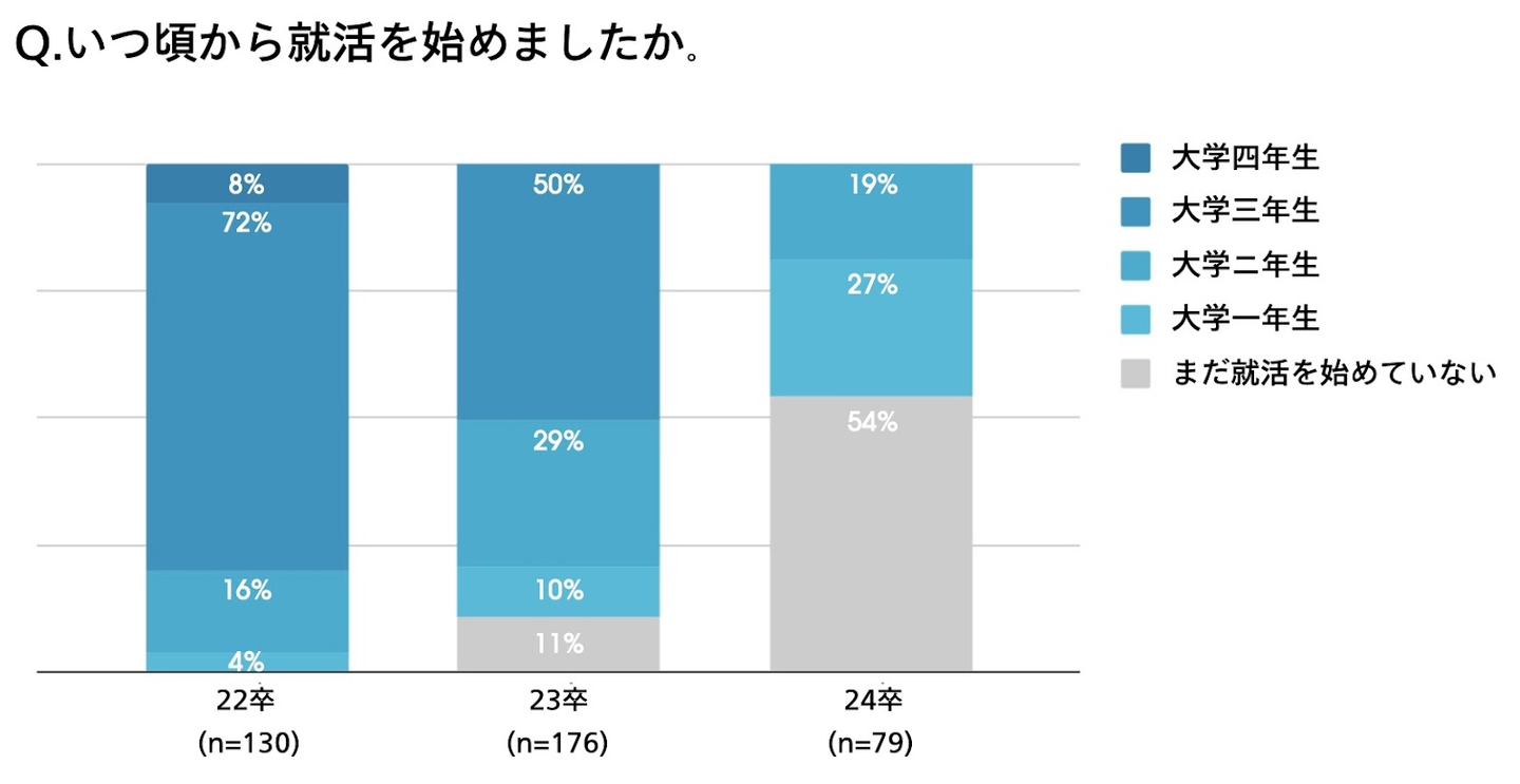 就活開始時期について聞いたところ、22卒の100%が、そして23卒の89%、24卒の46%の学生が既に就活を開始しているという結果に。大学一年生から就活を開始した学生の比率に注目すると、22卒の4%に対し、23卒では10%、24卒では27%と年々増加傾向にあり、就職に早期化の傾向が見られました。