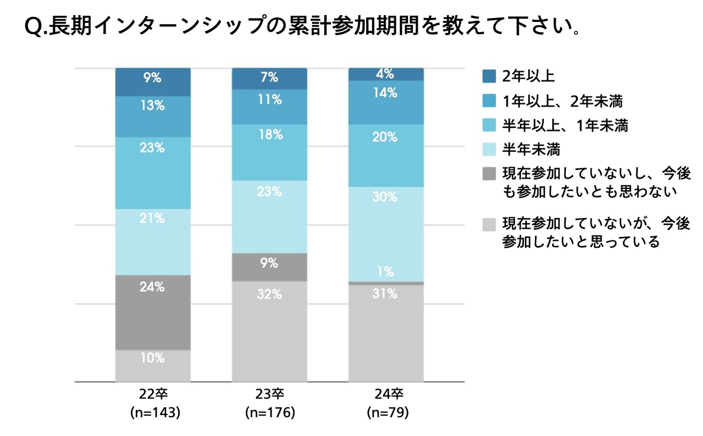 長期インターンシップへの参加割合においては24卒が22卒、23卒を上回る