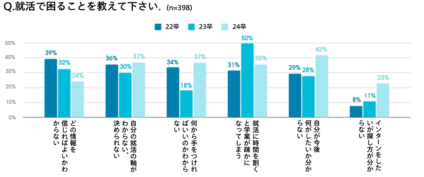 就活で困ることについて、22卒で最も多かったのは「どの情報を信じればよいかわからない(39%)」、23卒で「就活に時間を割くと学業が疎かになってしまう(50%)」、24卒で「自分が今後何がしたいか分からない(42%)」という結果に。実際に学生からは「それぞれ言うことが違うので、誰の言うことをどれだけ信じて良いのかよくわからなかった。」(筑波大学、四年生)といった声があがり、多すぎる情報や多様化するキャリア選択に課題を感じる声が見受けられました。