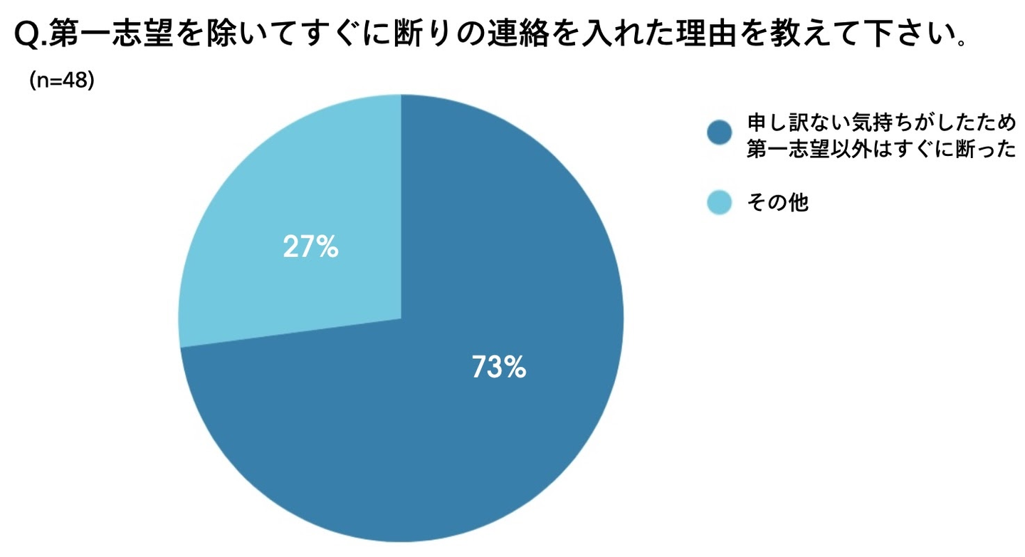 第一志望以外の内定先へと断りを入れた学生が挙げた理由で一番多かったのは「申し訳ない気持ちがしたため」で73%という結果に。