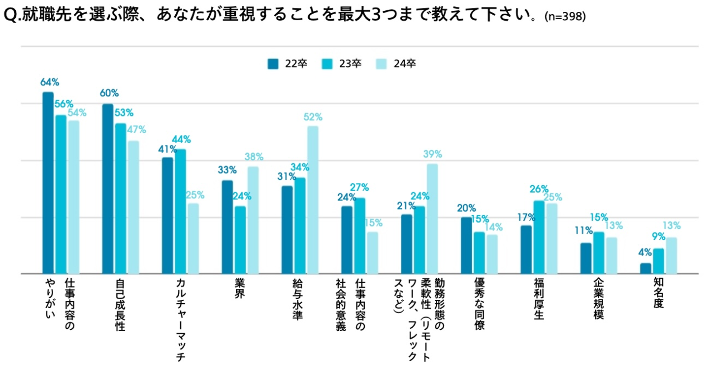 ・就職先選びで最も大事なのは「仕事内容のやりがい(22卒:64%、23卒:56%、24卒:54%)」